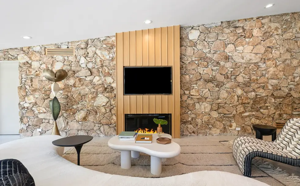 Elvis Presley and his new wife Priscilla Beaulieu honeymooned in this Palm Springs hideaway after their 1967 Las Vegas wedding. It sits on a half-acre cul-de-sac parcel at the foothills of the San Jacinto Mountains. From the outside, it resembles a ’60s spaceship that evokes that era’s vision of the future. But Cirillo and her husband Cary Collins have since modernized the home with the help of designer Michelle Boudreau.