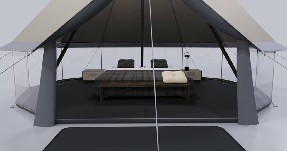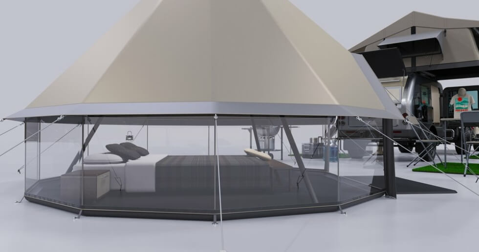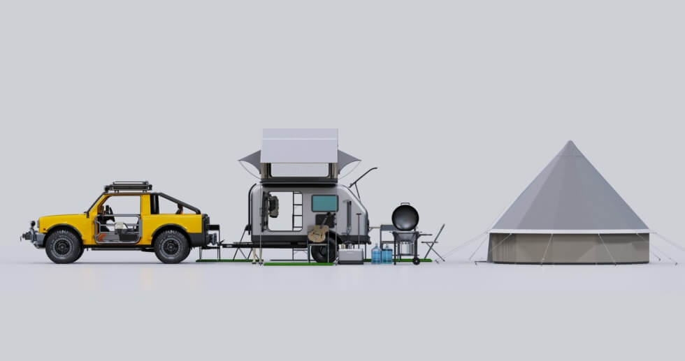 A teardrop trailer with ample storage features convertible seating and a sleeping area. Next is an exterior kitchenette, a rooftop pop-up tent with a telescoping ladder, and a picnic table with chairs. The CAMP also comes with a portable yurt with modular fabric walls and a California King size bed. Sadly, there is currently no word if this trim package will ever make it into production.