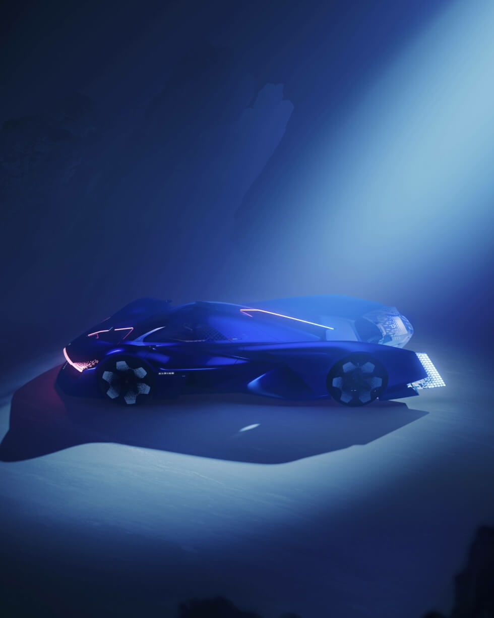 Beneath its bold aerodynamic recycled carbon fiber shell is an eco-friendly powertrain. We have a single seat in a center position with a racing steering wheel. It features transparent paddle shifters and an LED strip on the spine of the steering column.