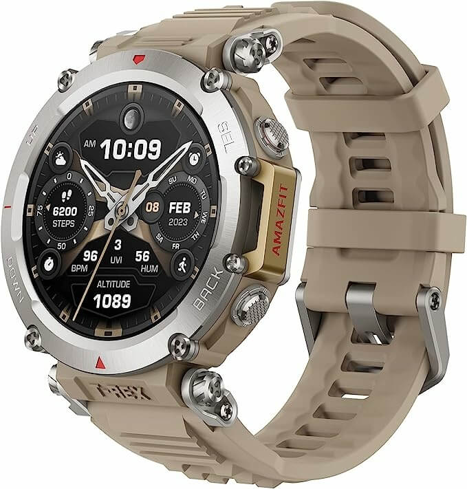 The 1.39” 454 x 454-resolution AMOLED display can hit a peak brightness of 1,000 nits to keep it visible in a variety of situations. Amazfit notes that its military-grade toughness will withstand extreme temperatures, and exposure to water, mud, and other debris that can damage other smartwatches. The T-Rex Ultra pairs with your smartphone for notifications and more. Go on an adventure with this on your wrist.