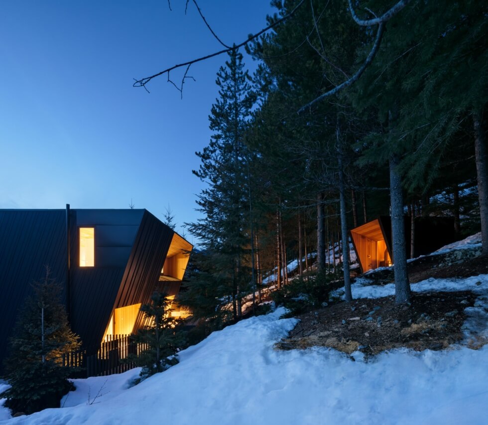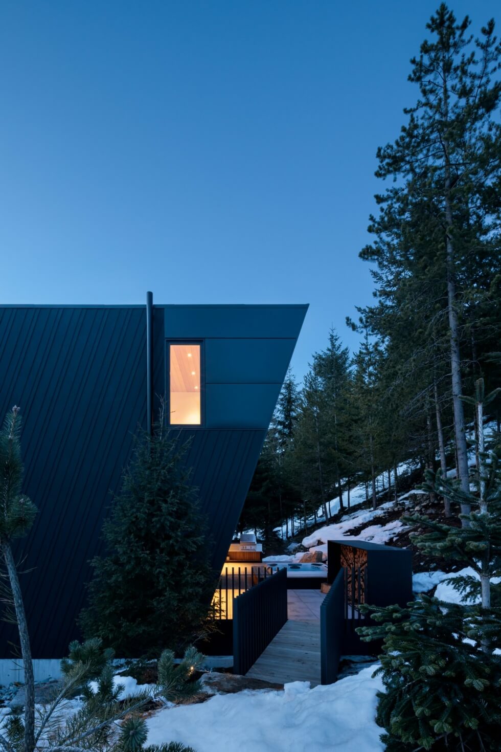 This 3,130-square-foot vacation house takes the shape of a parallelogram. It slants towards the mountaintop so it disappears into the scenery yet still offers mountain views from expansive glazing. It features an excavated ground floor clad in irregular standing seam metal on the front and rear. The sides on the other hand have durable Hardiplank.