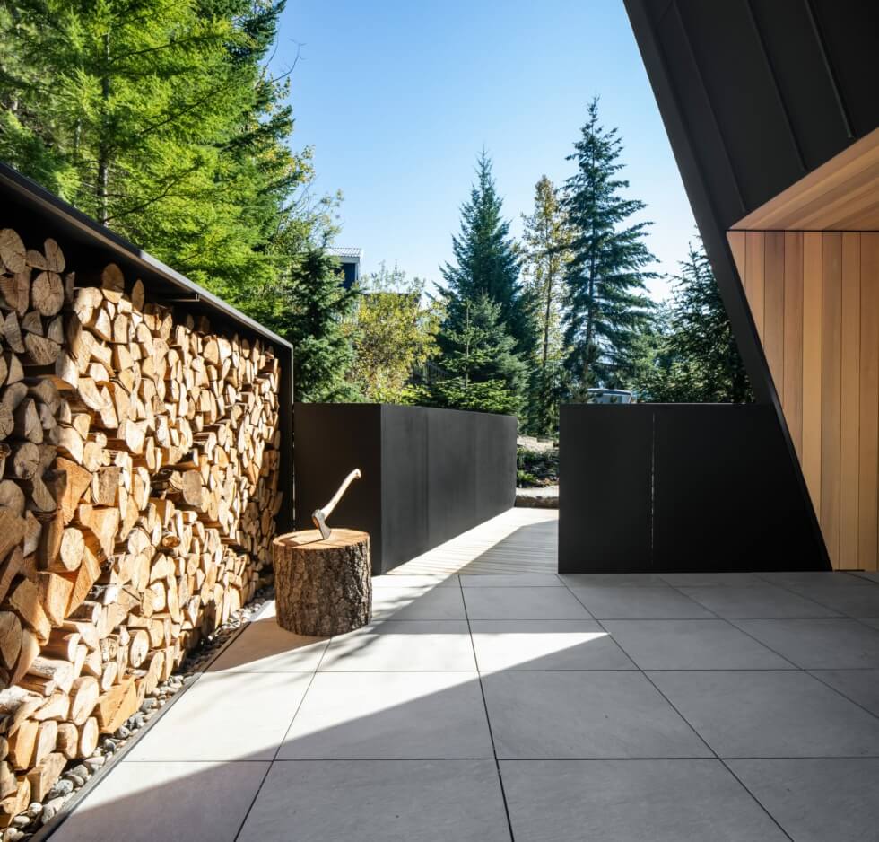 The Ambassador Crescent house sits embedded into the earth in its mountainside setting in Whistler, British Columbia. Vancouver-based studio BattersbyHowat Architects clad this three-story home in black metal and tucked it into a steep hillside near the famous ski resort town.