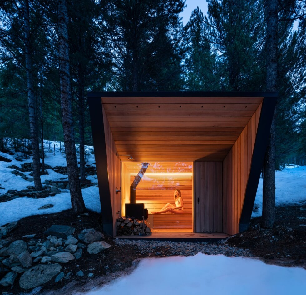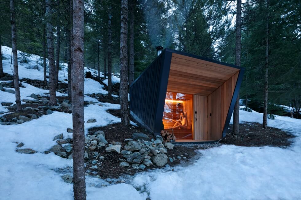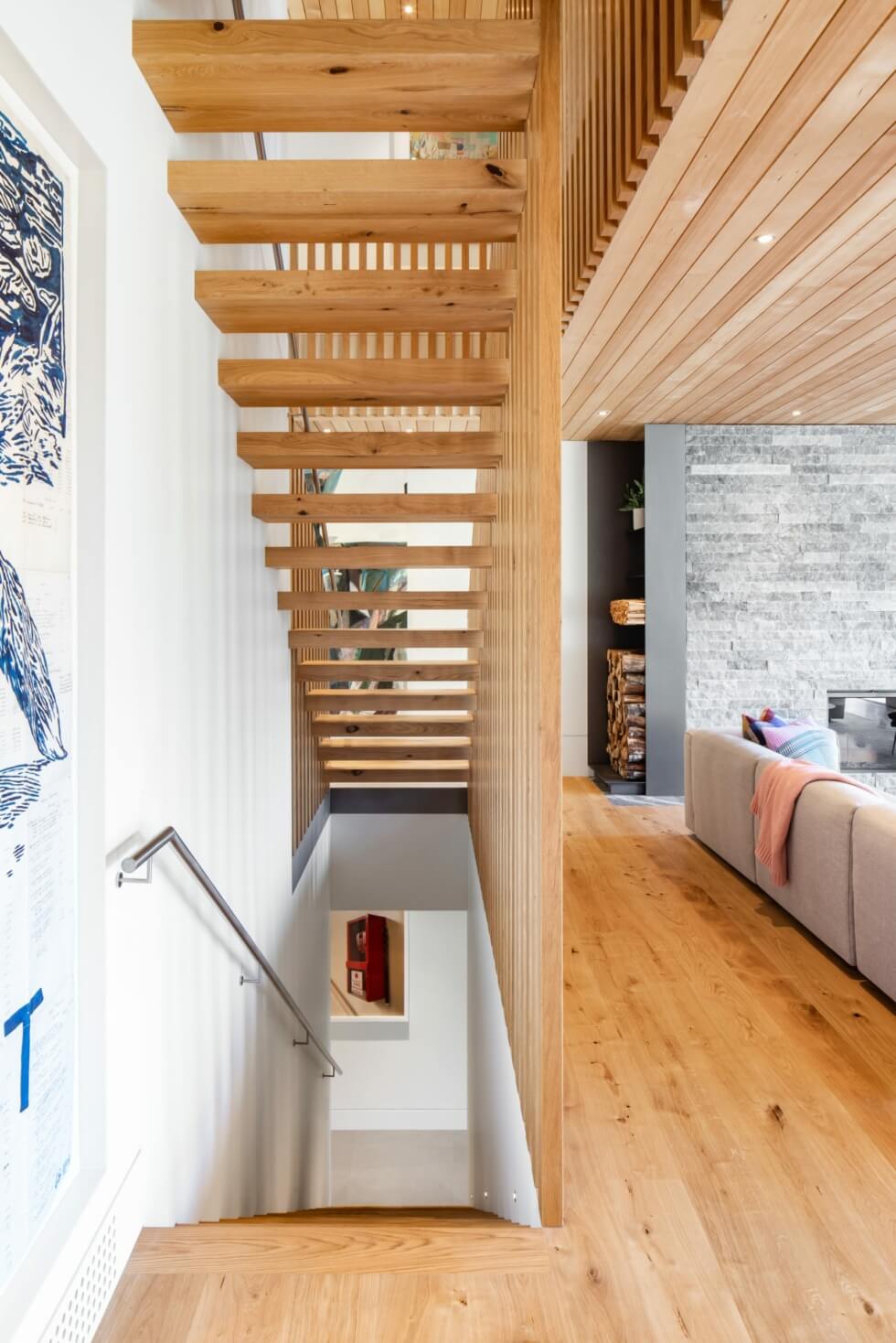 The first half of the vertical elements extend from the floor while the other half hangs from the upper level. The treads then connect in the center like a puzzle. The Ambassador Crescent house even comes with a small sauna further up the hill designed as a mini version of the house.