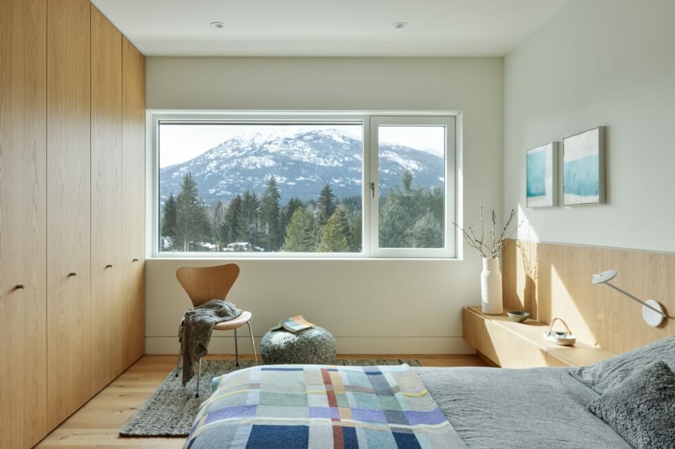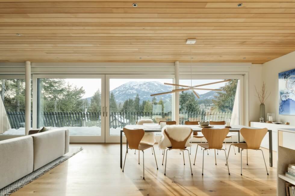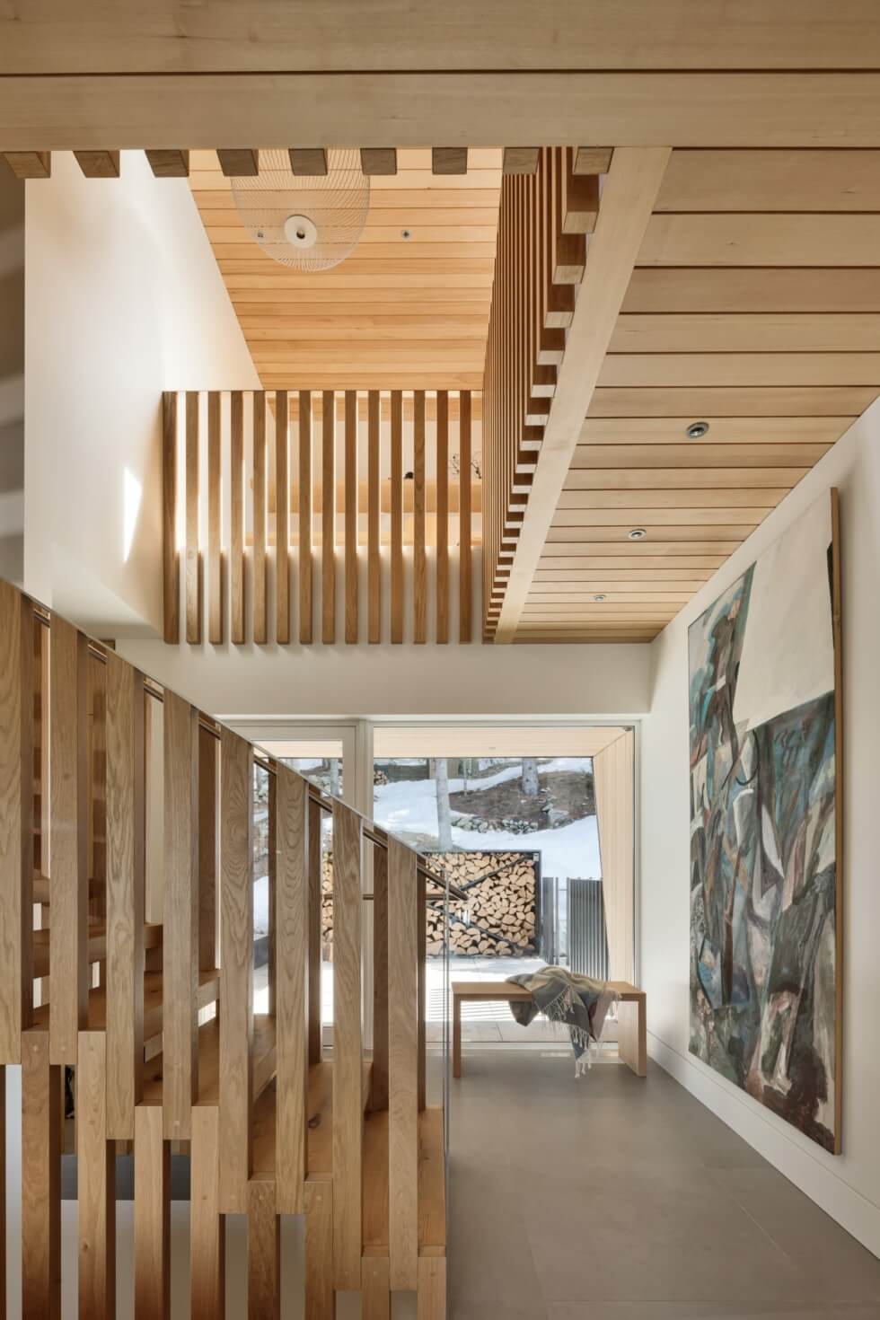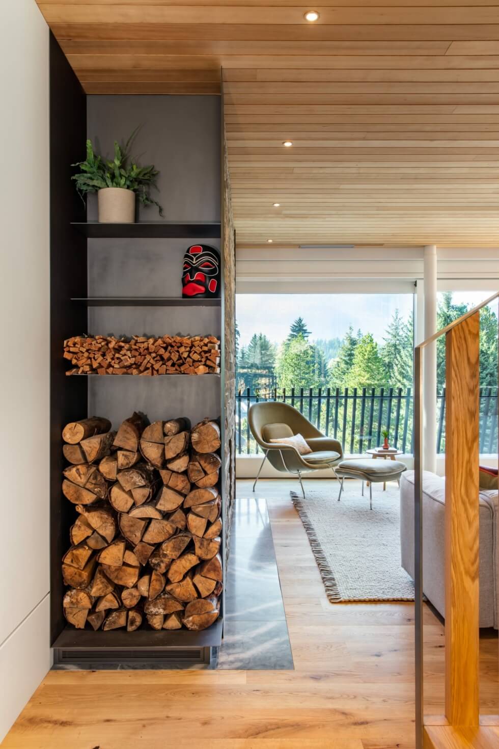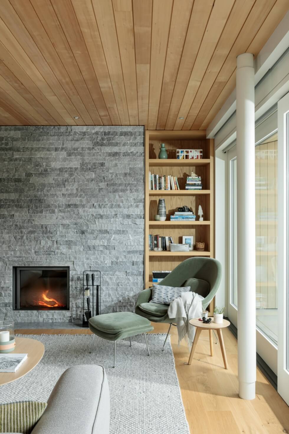 The Ambassador Crescent home boasts interiors with shared spaces on the primary level and private spaces on the third floor. Interior finishes come in a simple palette that creates a warm and inviting ambiance for year-round use. The house mostly used white oak for the surfaces complemented by crisp white walls and a gray stone fireplace wall.