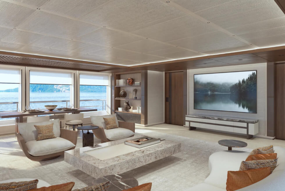 For example, the top deck holds a jacuzzi which guests can access via elevators or the internal stairs. Meanwhile, the 2,100-square-foot aft beach club showcases a glass-bottom pool and fold-out side decks.