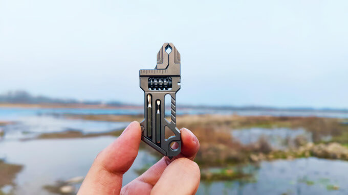 You can easily insert the bit directly into the T-shaped rabbet from the rear and then attach it to the main body via magnetic force. This way, ensuring it doesn’t fall or move around during transport. Aside from these two utility tools, the Angie Ti EDC Wrench also serves as a bottle opener, a measuring caliper, and has a window breaker/package opener at the end. It is machined from lightweight, tough, robust, and corrosion-resistant Gr5 titanium. Weighing just 32.6g and just 2.91″ long, you can use it as a pendant, hang it on a keychain, or easily slip inside your pocket.