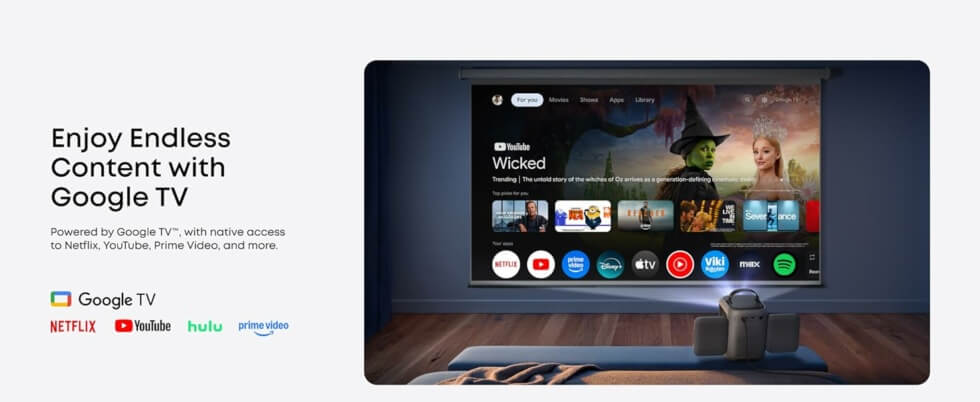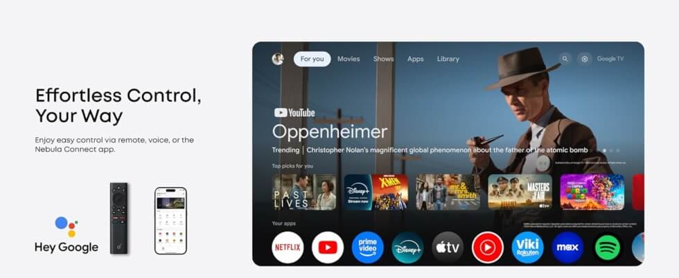 To ensure dust and other smaller particles do not damage the optical engine, the system relies on an all-glass build, which is then sealed. The Nebula P1i runs Google TV with full support for popular streaming services such as Netflix, Prime Video, and other apps available through the Play Store.