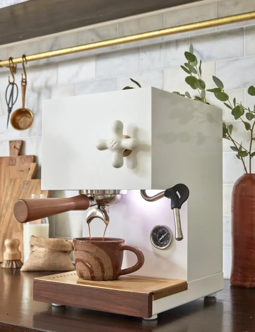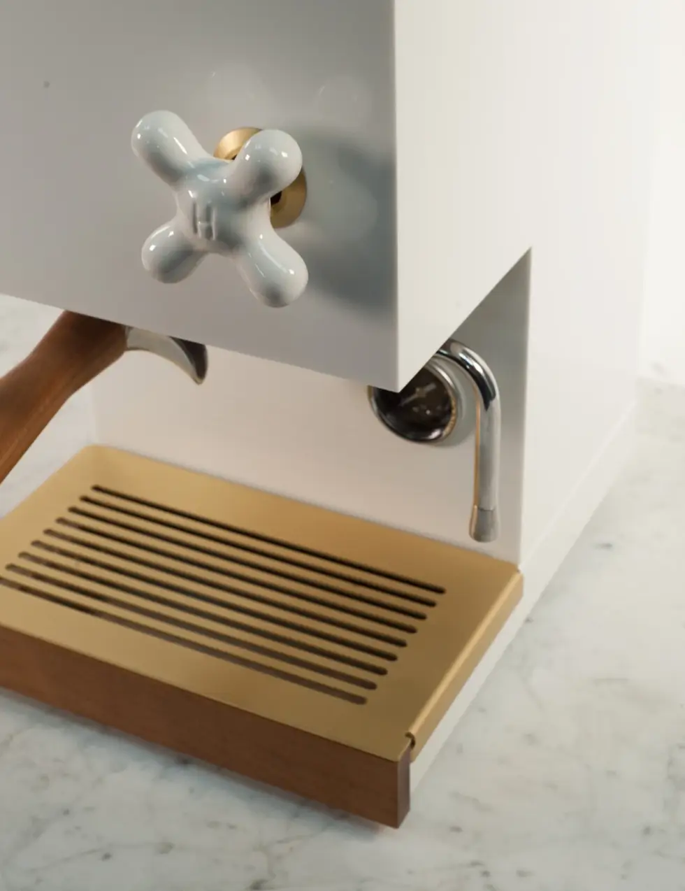 Meanwhile, the White AnZa Espresso Machine prefers to keep it sleek with a seamless crisp surface. It features oiled wood and brass for its Ø58 mm portafilter and drip tray. The top plate is in brass which creates a beautiful contrast to the steel switches. Both designs have porcelain and brass features for their steam knob.
