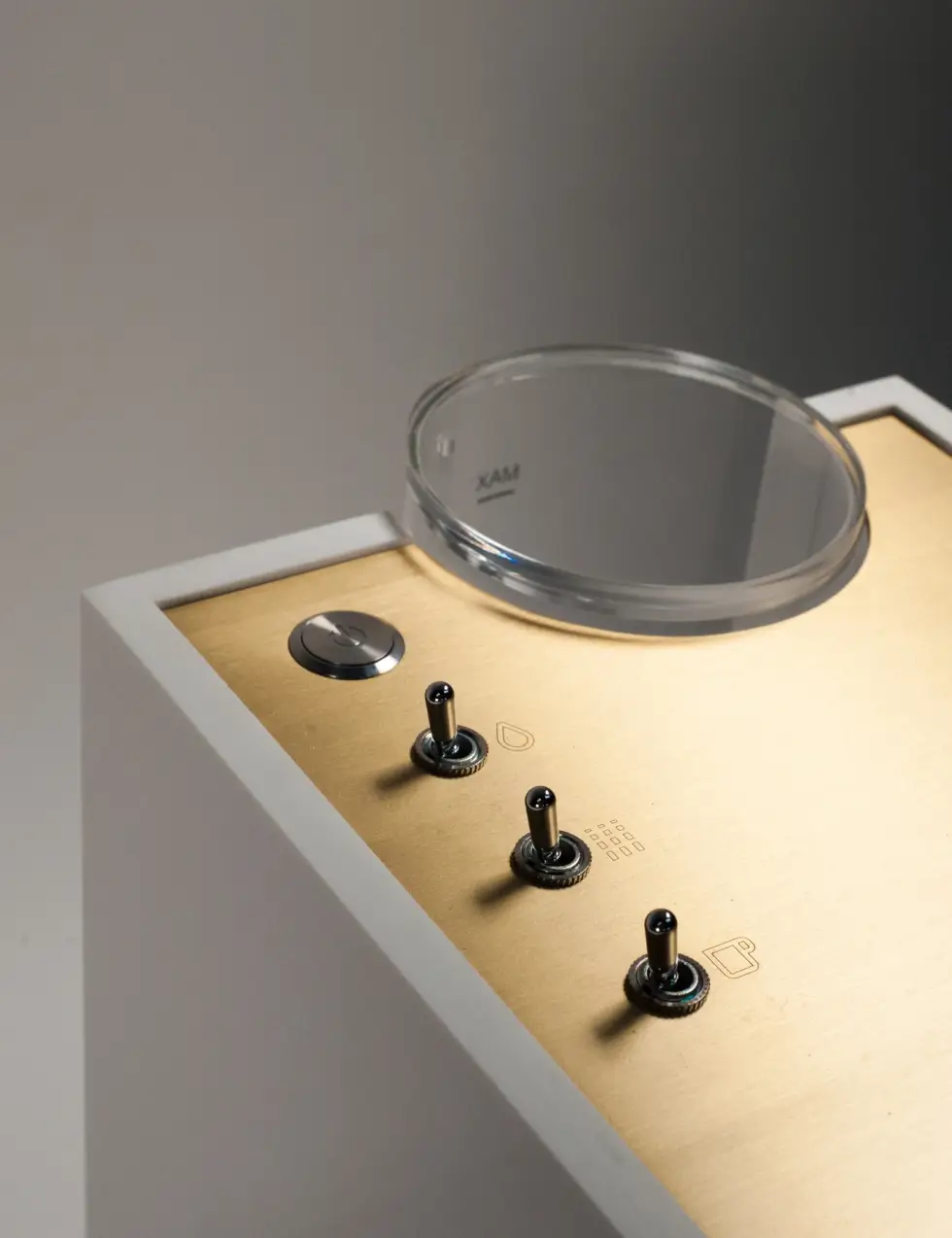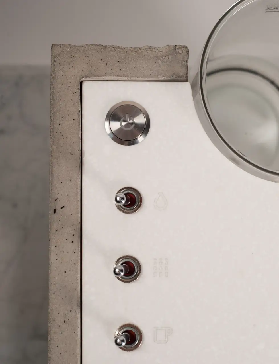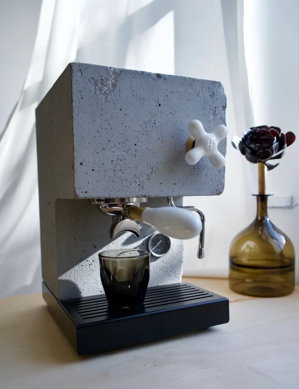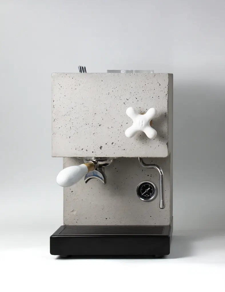 This unconventional coffee brewer comes in two designs: the AnZa Concrete and AnZa White. The concrete version is made with a hand-cast concrete shell with a powder-coated steel drip tray and brass and porcelain accents for its Ø58 portafilter. Its top plate is solid Corian which accentuates the toggle switches and the concrete shell.