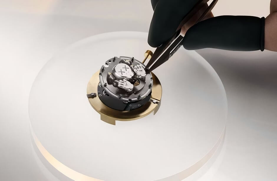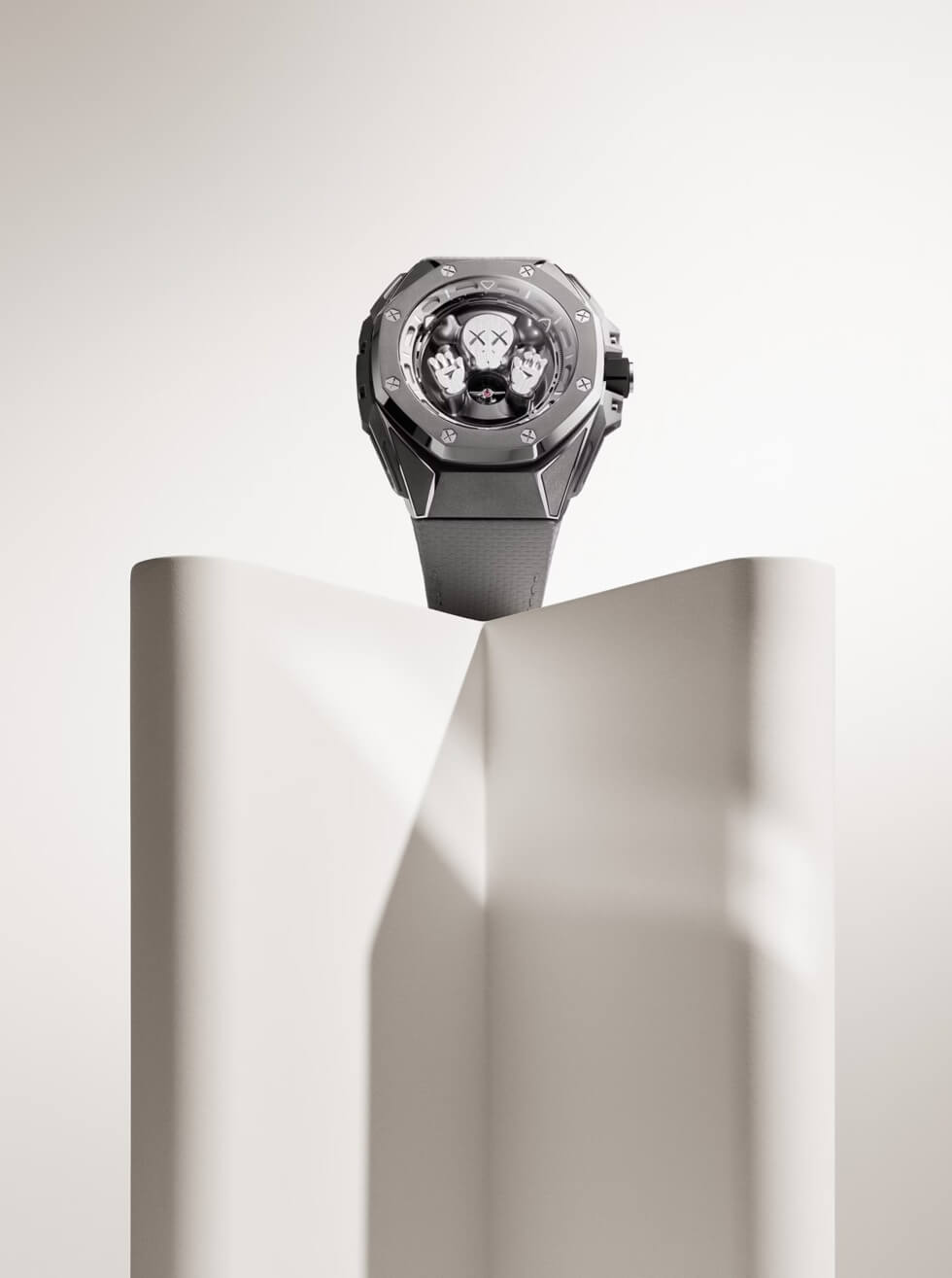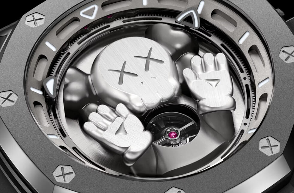 The hand-wound mechanism operates the peripheral hours and minutes of the AP x KAWS Royal Oak Concept Tourbillon Companion. Framed right below the sapphire crystal is a “Companion” figure in micro-blasted and satin finishes. For low-light readability, the indicators and capsule hour markers are coated in luminescent paint.