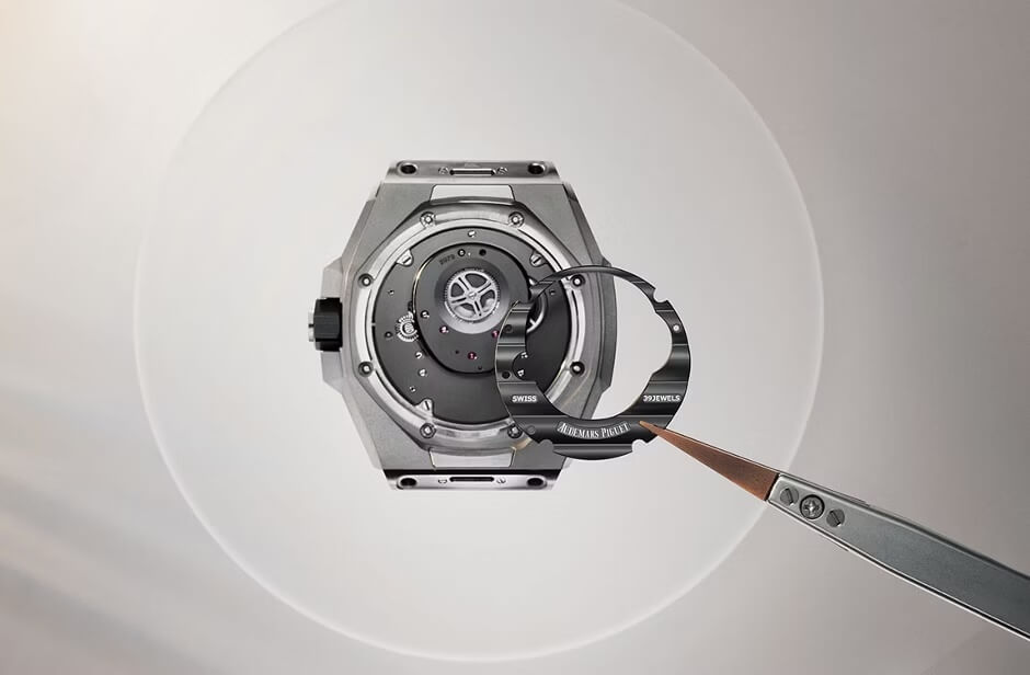 A light gray calfskin leather strap with color-matching stitching and an AP folding clasp closure accompanies the wristwatch. To the right is a black ceramic screw-down crown, while the open-work case back showcases the in-house Calibre 2979. This manual movement features 326 parts, 39 jewels, and a power reserve of 72 hours. It measures 32.3 mm x 10.4 mm.
