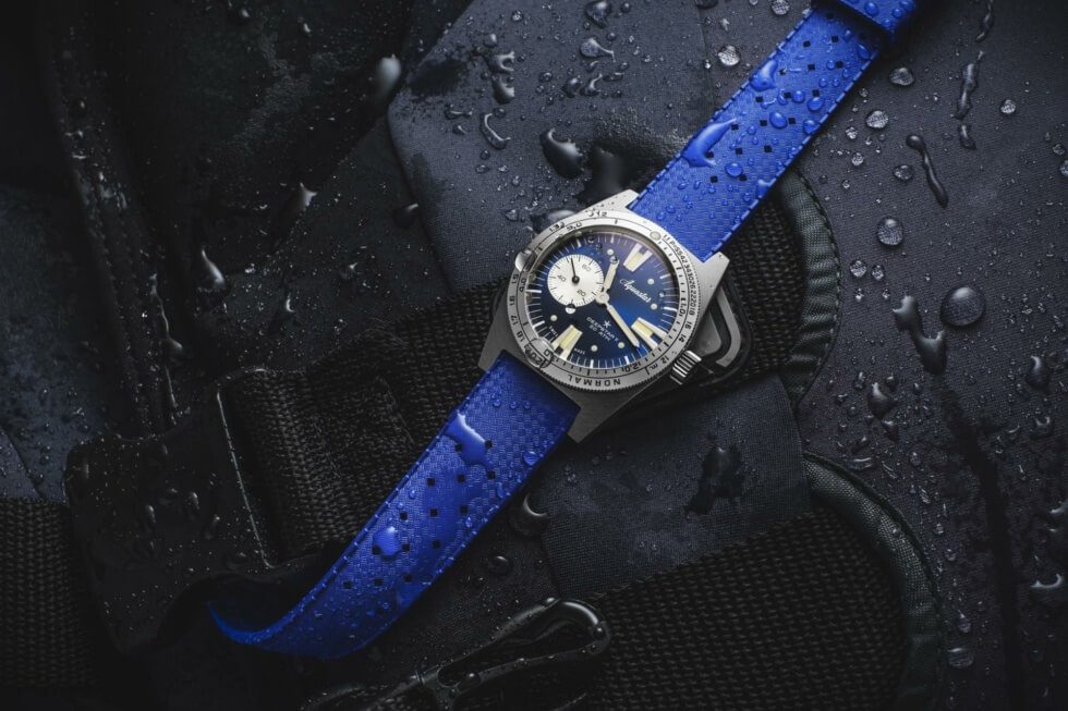 “Being a result of recreation of one of the most influential dive watches of the 60s, the unique and uncluttered mono sub dial, and the patented multiple dive decompression bezel table make the Deepstar an unmatched diver-oriented tool with an instantly recognizable design,” writes Aquastar.