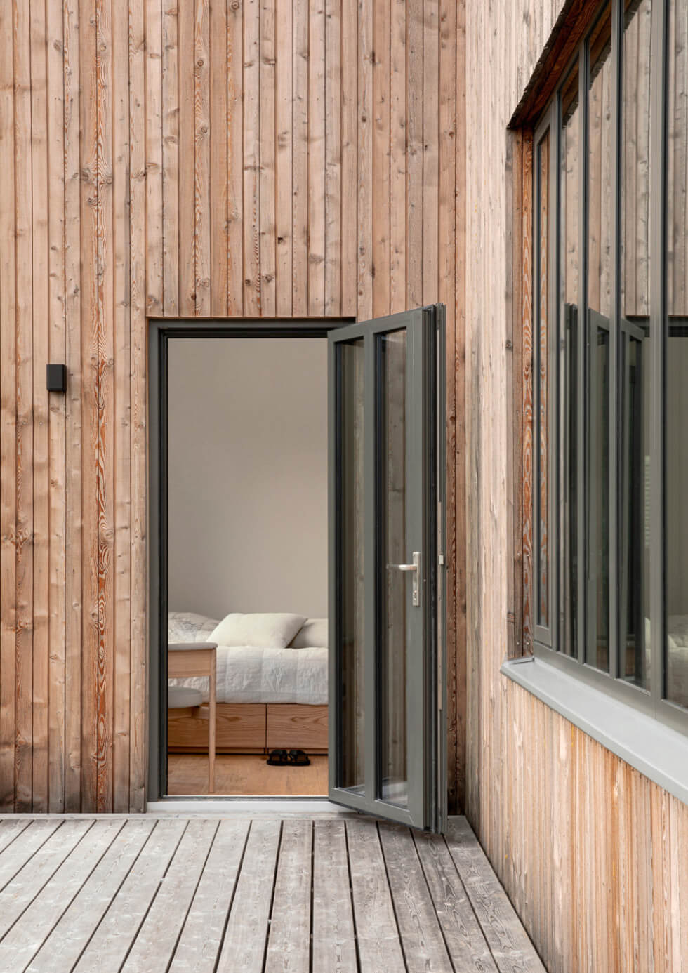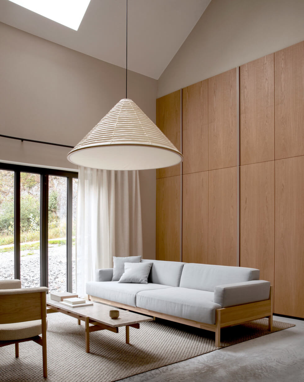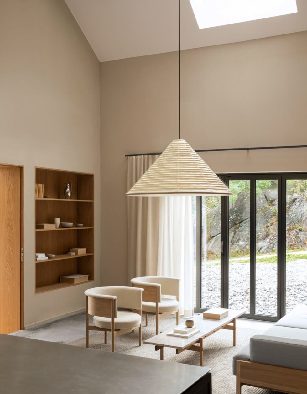 Norm Architects designed this house to embody both Scandinavian and Japanese aesthetics, as seen from its minimalistic yet functional construction. It puts the focus on the beautiful natural scenery rather than on the house itself. The Japanese inspiration is most notable in the pebble gray sofa, stone-topped coffee table, and armchair pairs upholstered in creamy fabric: all made in collaboration with Japanese brand Karimoku Case Study, the sister brand of Karimoku.