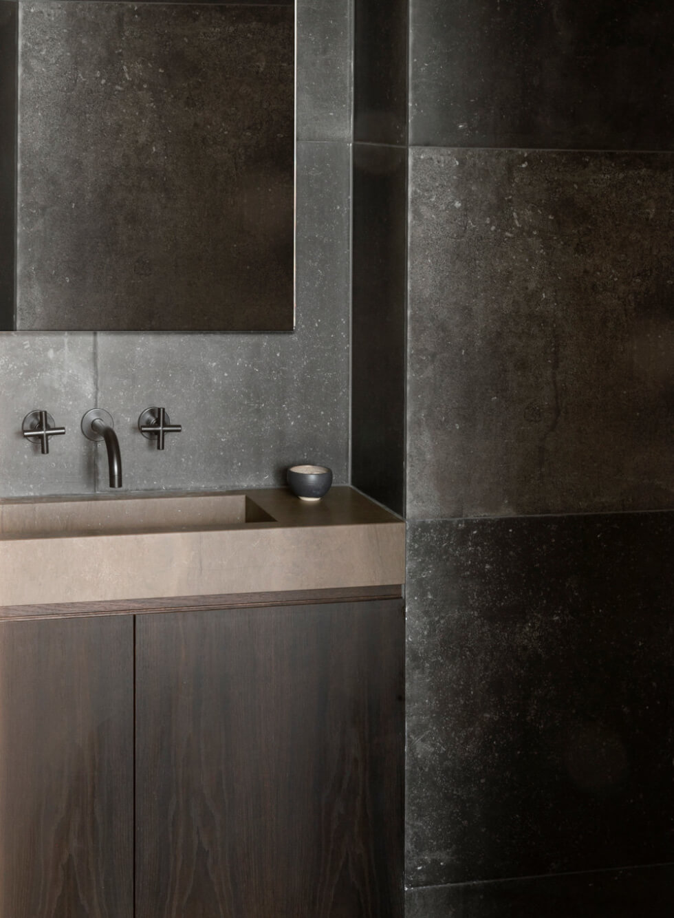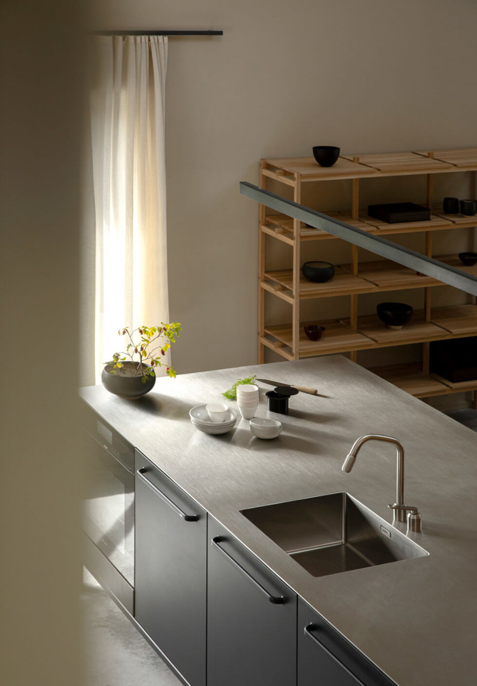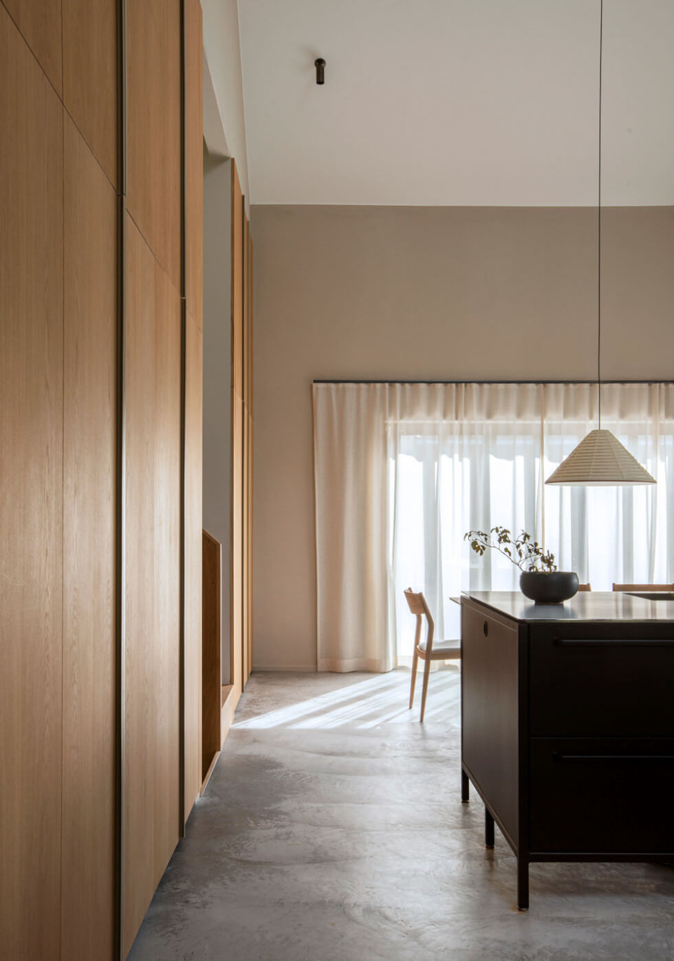 Norm Architects designed this house to embody both Scandinavian and Japanese aesthetics, as seen from its minimalistic yet functional construction. It puts the focus on the beautiful natural scenery rather than on the house itself. The Japanese inspiration is most notable in the pebble gray sofa, stone-topped coffee table, and armchair pairs upholstered in creamy fabric: all made in collaboration with Japanese brand Karimoku Case Study, the sister brand of Karimoku.