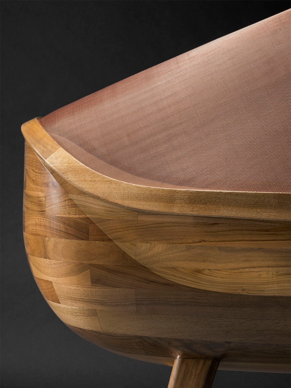 Meanwhile, there’s the hull which resembles a mother’s womb or a boat, crafted from smoothened and rounded walnut. It has a fine copper weave pressed into the wood to protect against electromagnetic waves. The lightest part of the Argo Crib is the “sail,” which features a carved walnut frame surrounded by a flexible veil of woven copper wire. The sail allows for air to pass through even when the crib is fully closed. This way the baby stays comfortable inside.