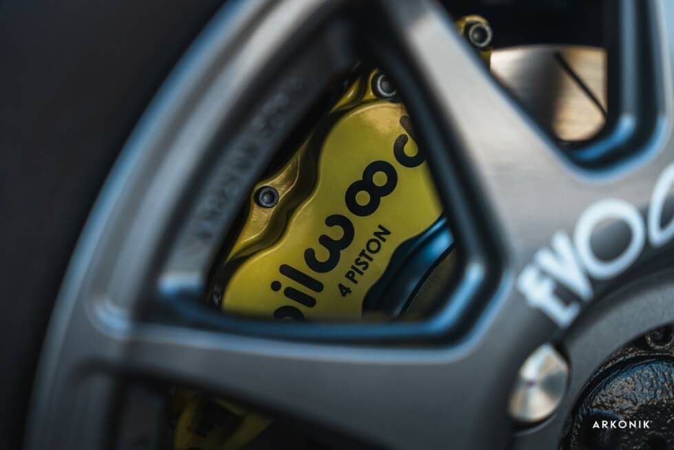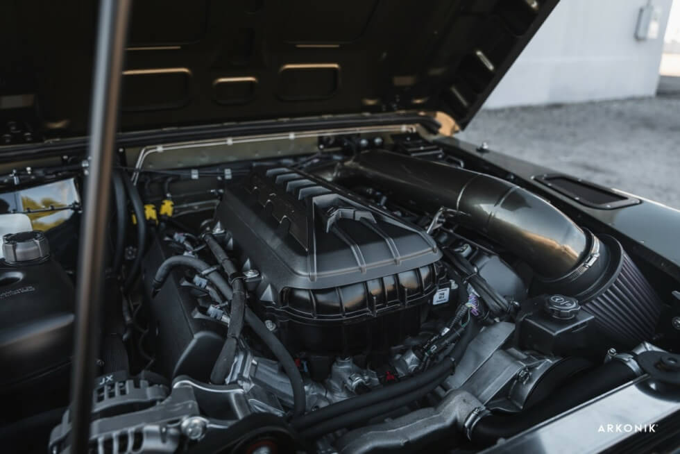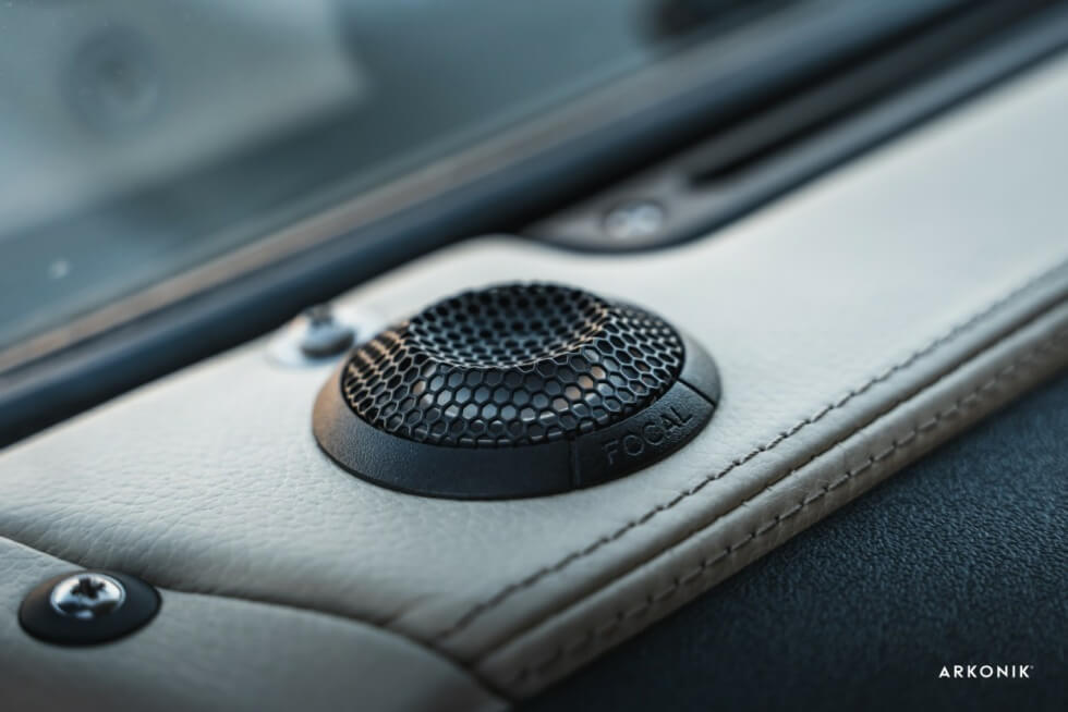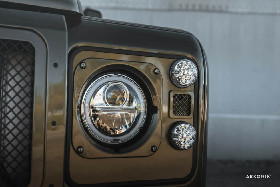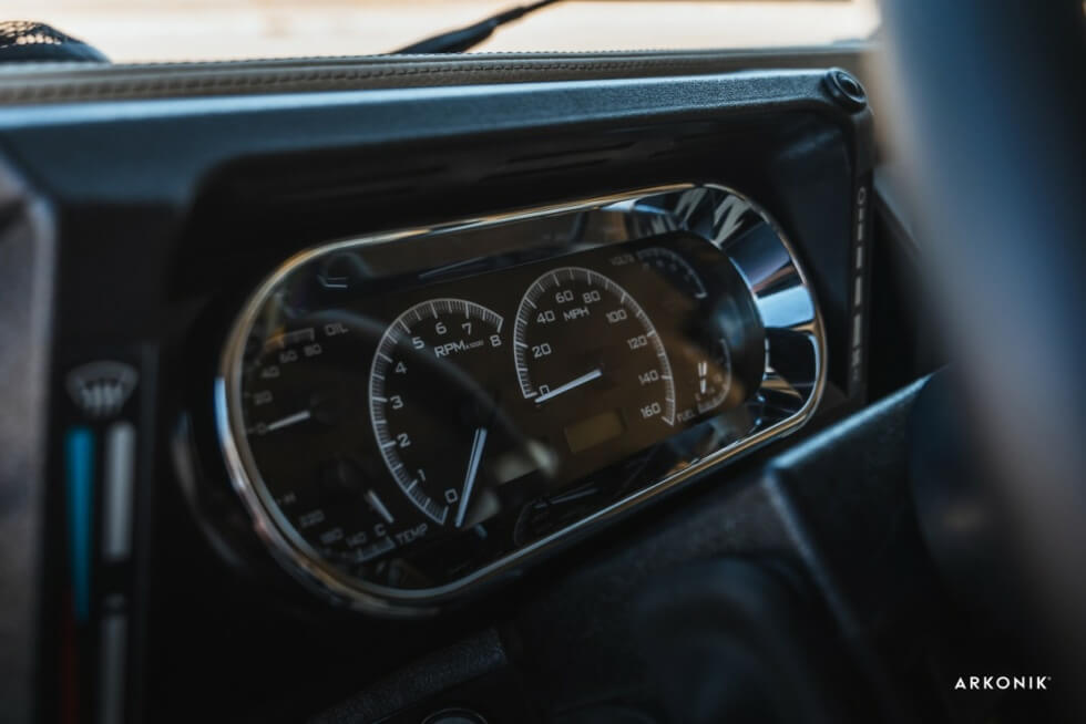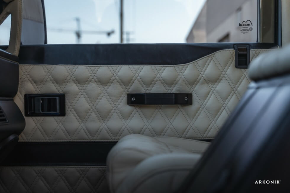 Lighting systems are replaced with Wipac 7″ Halo LED headlights and clear side lights. Arkonik also replaced the standard hood with an OEM Puma, and tinted all windows in Light Smoke. As for the interior, we have RECARO Cross Sportster CS front row seats upholstered in Manilla Leather with diamond stitching, and matched on the gear gaiter and door cards.