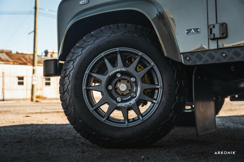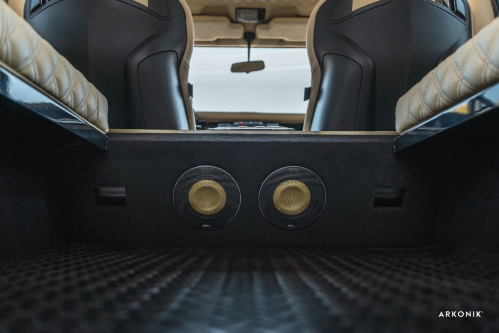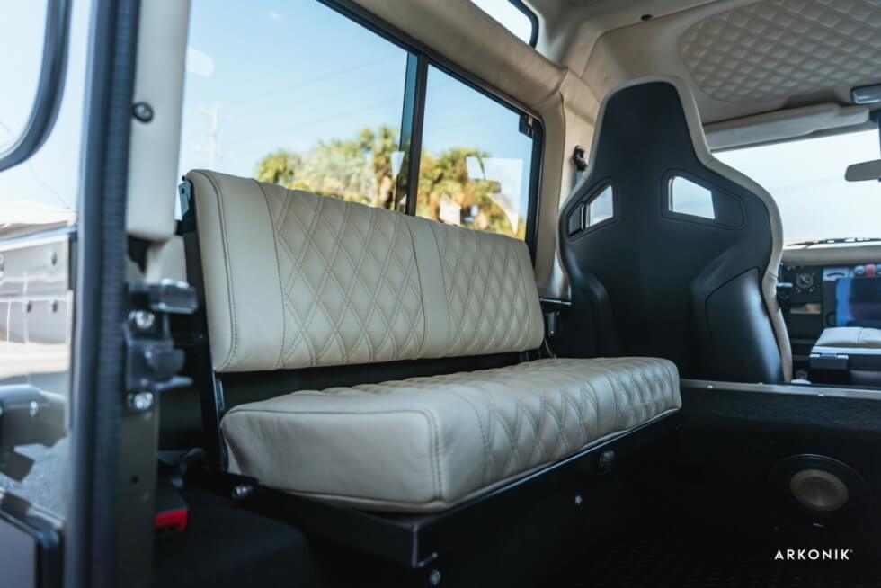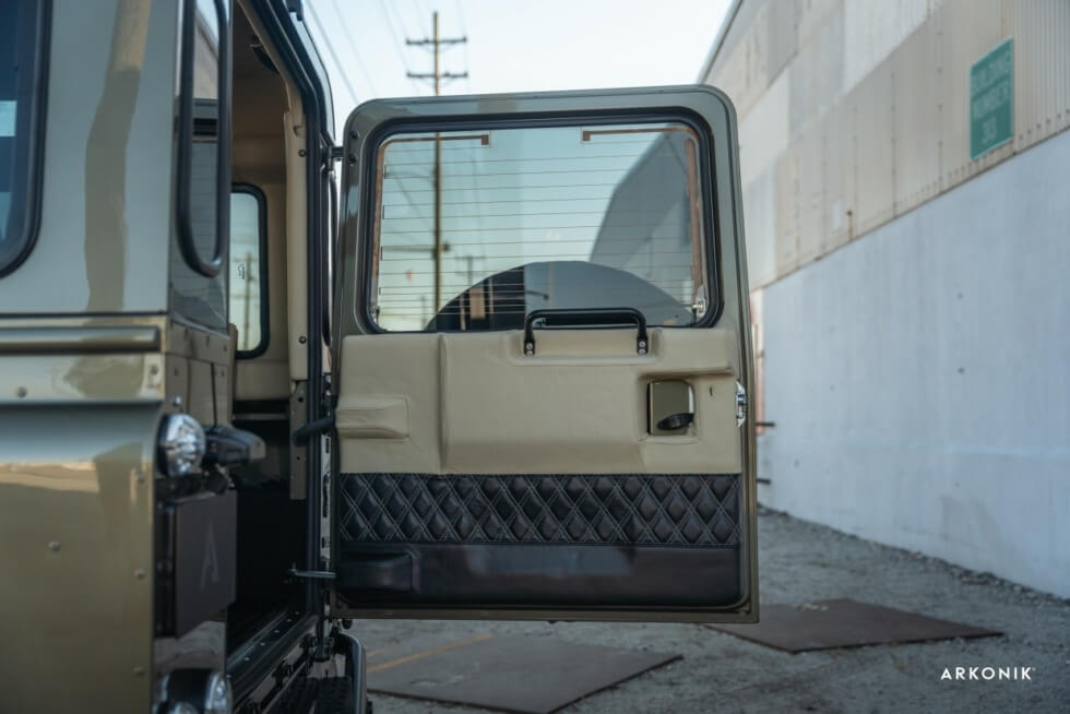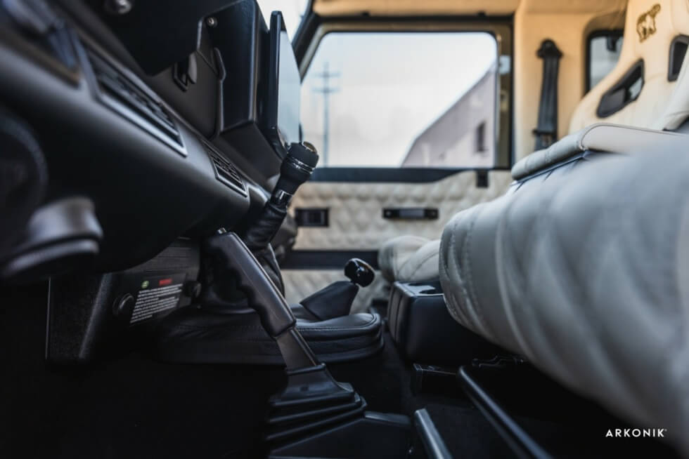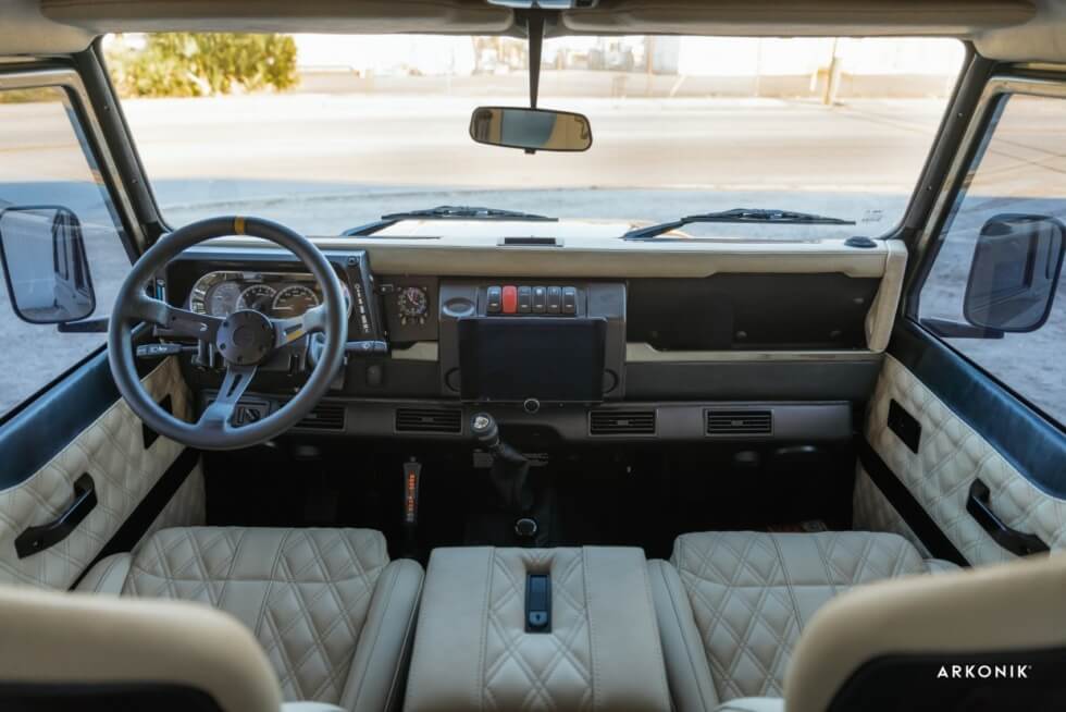 Drivers are looking at a MOMO MOD.08 black leather 14″ steering wheel and a Dakota Digital dashboard. Infotainment is supplied by a Kenwood touchscreen head unit paired with Focal speakers and a subwoofer. As you can see, the Arkonik FU Dog is brimming with more premium bells and whistles than a Land Rover fan could ask for.