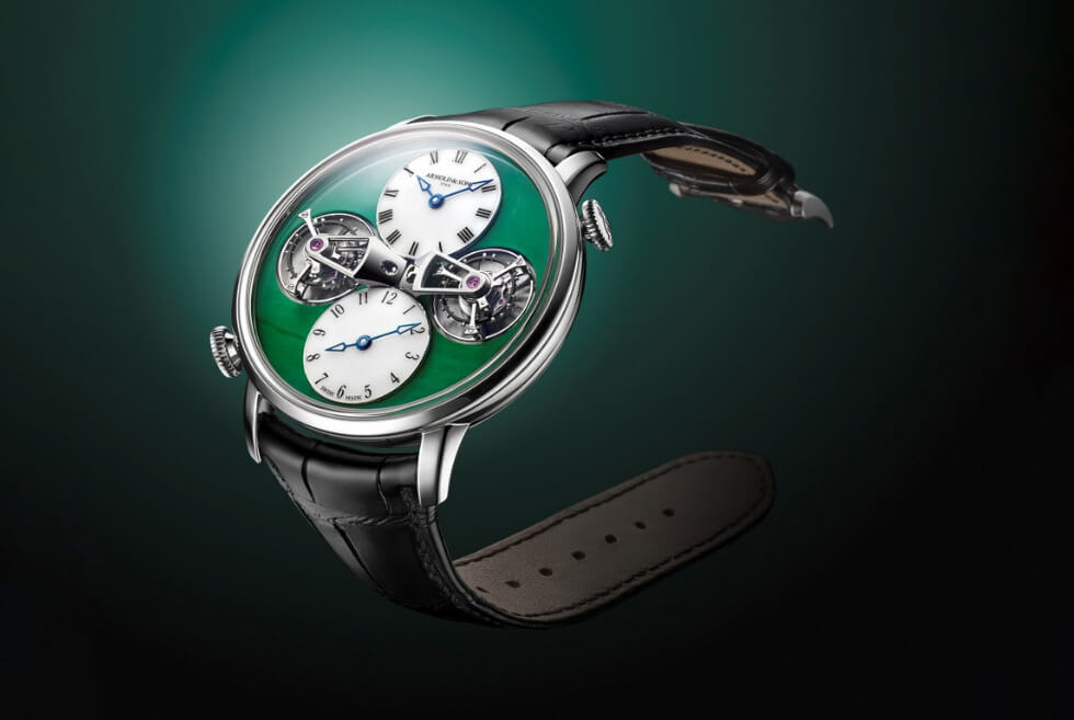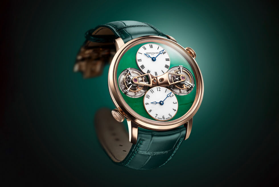The Arnold & Son Double Tourbillon Jade is paired with a hand-stitched alligator leather strap in green or black with a pin buckle closure. Finally, the in-house A&S8513 manual movement governs everything you see here.