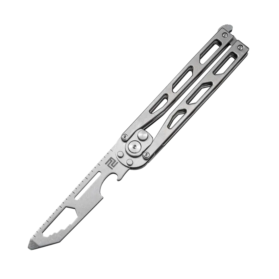 At a glance it looks just like a butterfly knife, but it’s actually a hybrid of three different genres. It’s a butterfly knife, a multi-tool, and an automatic knife in one. When you flip it open it reveals several useful features. Its 440C stainless steel blade in a stonewashed finish comes with a bottle opener, two hex wrenches, and a screwdriver on the tip.