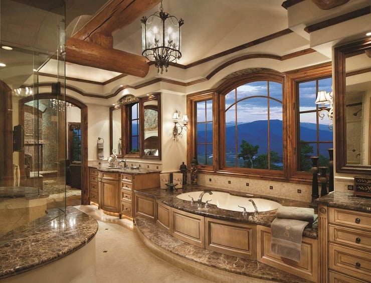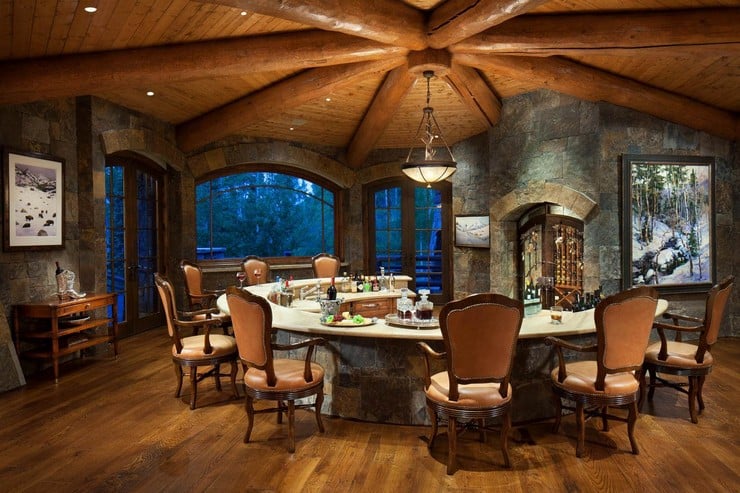 The main section of the house is centered between two wings that hold the master suite & guest house and is connected via bridges over carefully landscaped waterfalls and streams. Inside, you will find 10 bedrooms, 15 full baths, and 2 half-baths, so no dweller will ever have to wait for their bathroom turn. This super ranch is intended for maximum enjoyment, offering a home theater, a steam room, stables, billiards room, spa, and bowling alley. Relaxation is aided by multiple fireplaces and the wine cellar, plus the spectacular scenery of the surrounding Rocky Mountains.