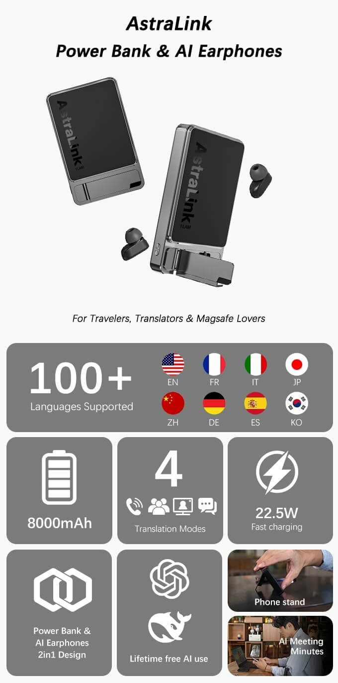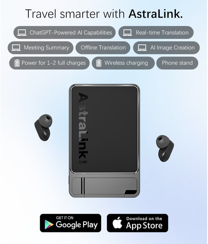 AstraLink’s versatility is in its AI translation feature which is available in four modes. One is through an integrated GPT-5 tech-powered compact and lightweight AI earbuds. Equipped with ENC (Environmental Noise Cancellation), the earbuds ensure voice clarity even in crowded or windy outdoor settings. It provides accurate and natural translations across 100+ languages.