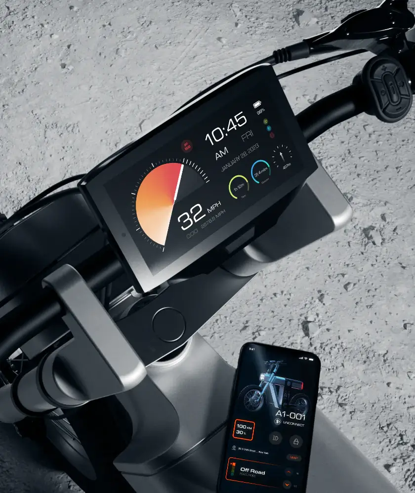 Telemetry and other crucial information are displayed on a 4.0” LCD screen. Battery capacity is listed at 960 Wh (48V 20 Ah) which is good for up to 75 miles. Swap this out for the optional 1920 Wh (48V 20 Ah) option to boost the range up to 150 miles. “Powerful, stylish, and durable, A1 is function and form perfected,” notes ASYNC.
