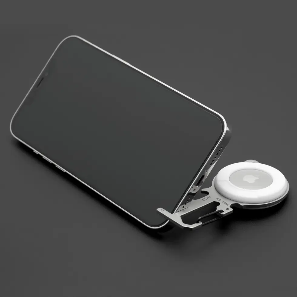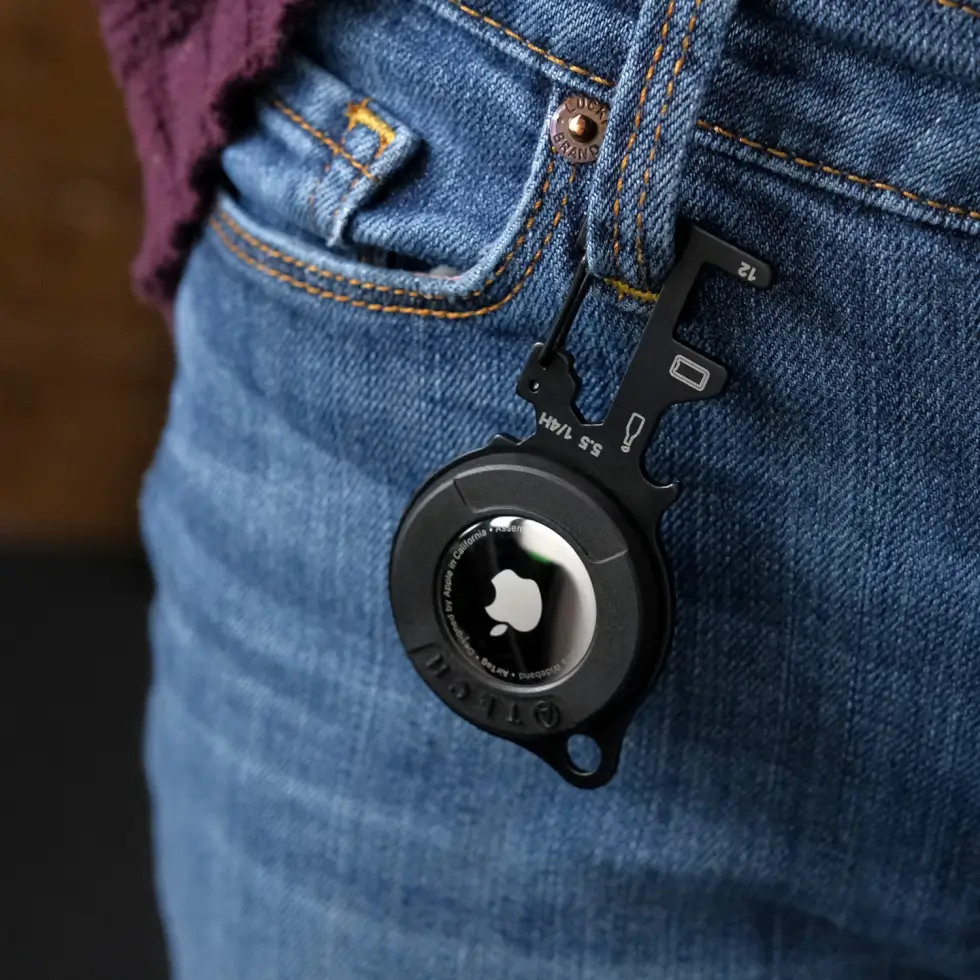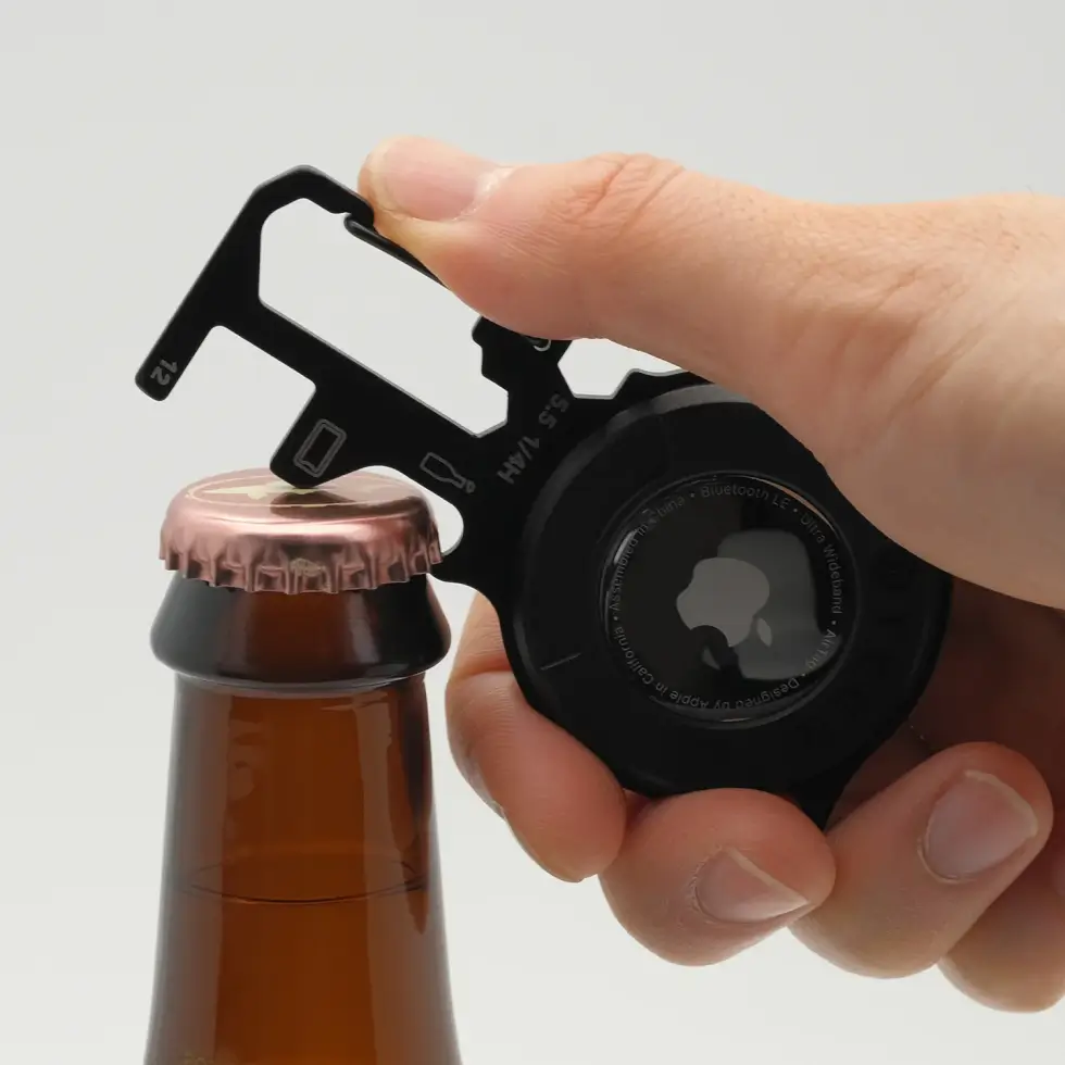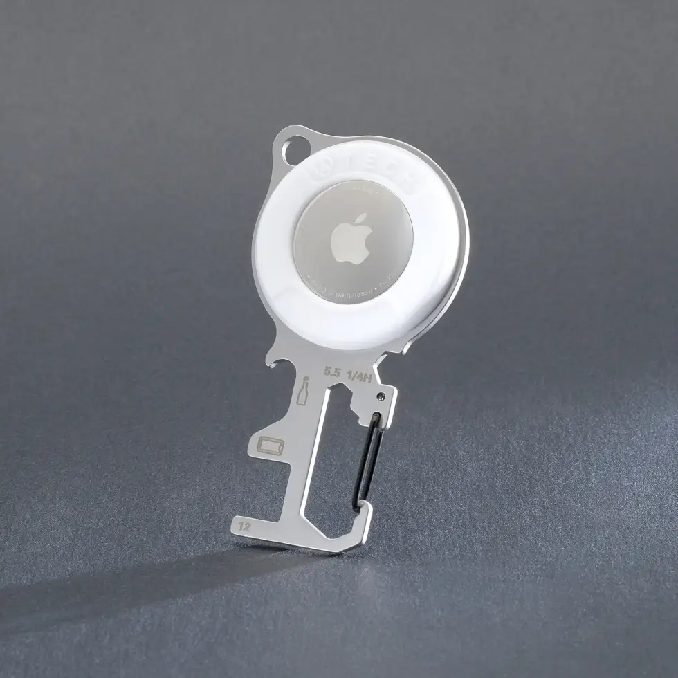 This device packs seven useful functions as an AirTag holder. It serves as a keychain for your most-used keys, as a phone stand, as a carabiner, and as a bottle opener. It is also the perfect bicycle tool as it has wrenches. These include a 1/4H hex wrench, a 5.5mm hex wrench, and a 12mm hex wrench.