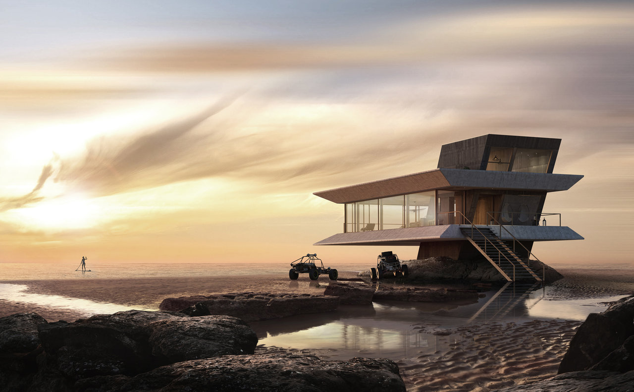 Their proposal starts off with a panoramic beachfront property that sits along a rocky shoreline. On this location will rise a modern geometric retreat that calls out to those who love the sea. We can already imagine chilling out with the sound of the waves as our background beat.