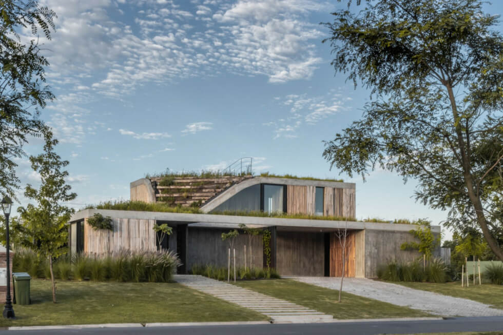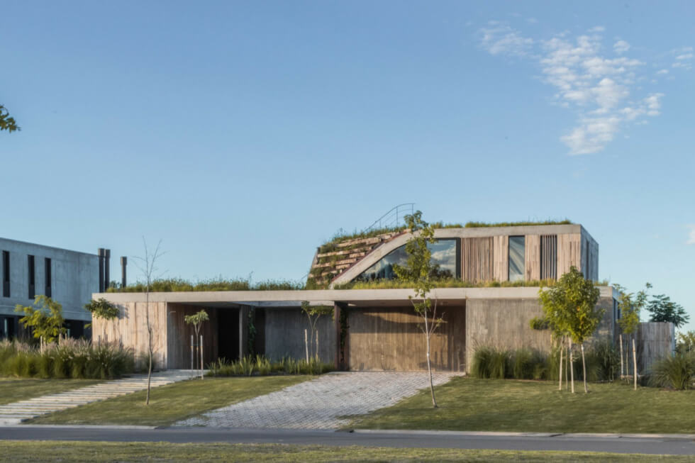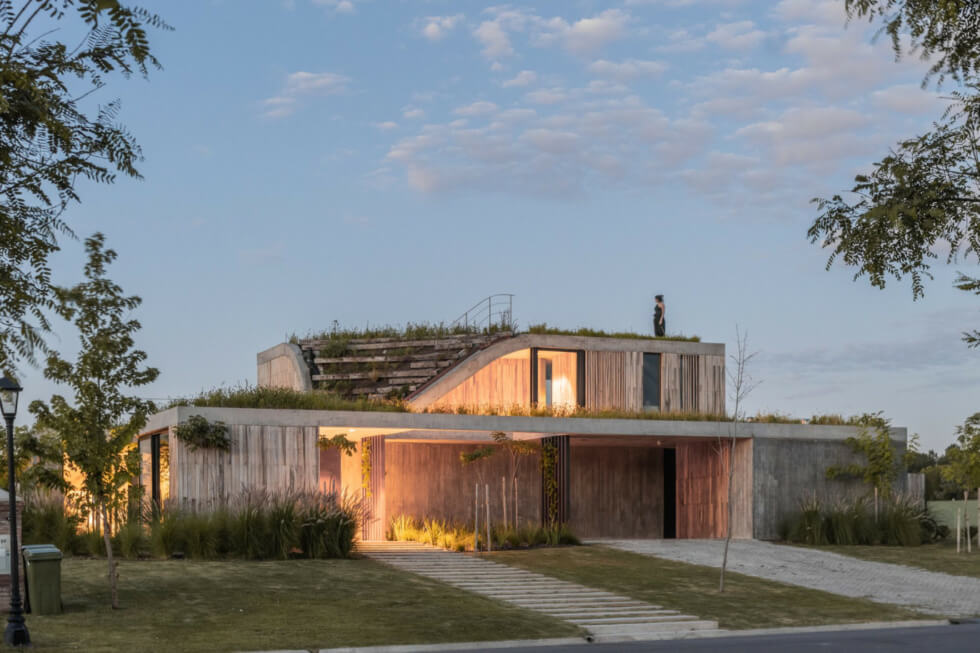 The studio designed a two-level home that blends with its topographical setting by using natural elements of concrete and wood and incorporating a green roof. The home encourages residents to be their authentic self without restrictions where they can live in harmony with themselves and their surroundings.