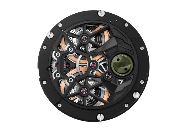 This is AP’s first use of green ceramic, and the results are remarkable. You get a geometric titanium case that measures 44 mm x 16.1 mm with an exhibition case back. From here, you can see the black bridges that hold the 24-jewel caliber 2954 manual-winding movement. It boasts a 237-hour power reserve.