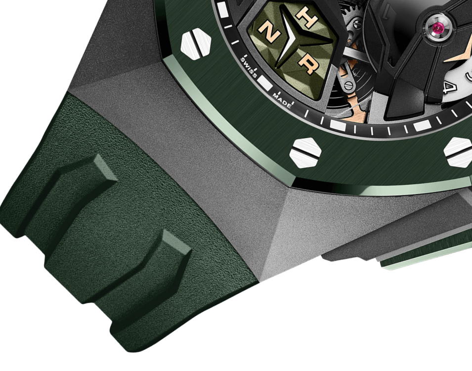The screw-down crown is also green ceramic along with the single pusher to its side. Titanium guards add a layer of protection against the occasional bump here and there. Beneath the Royal Oak Concept Flying Tourbillon GMT’s glareproof sapphire crystal is an avant-garde dial design with plenty of geometric shapes.
