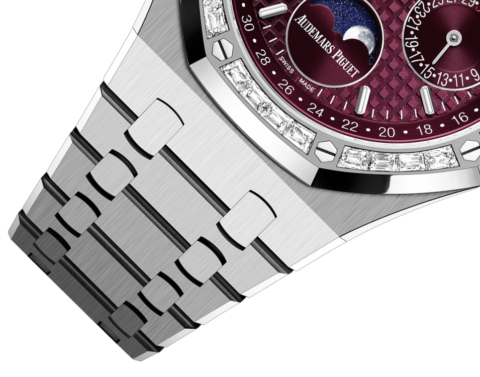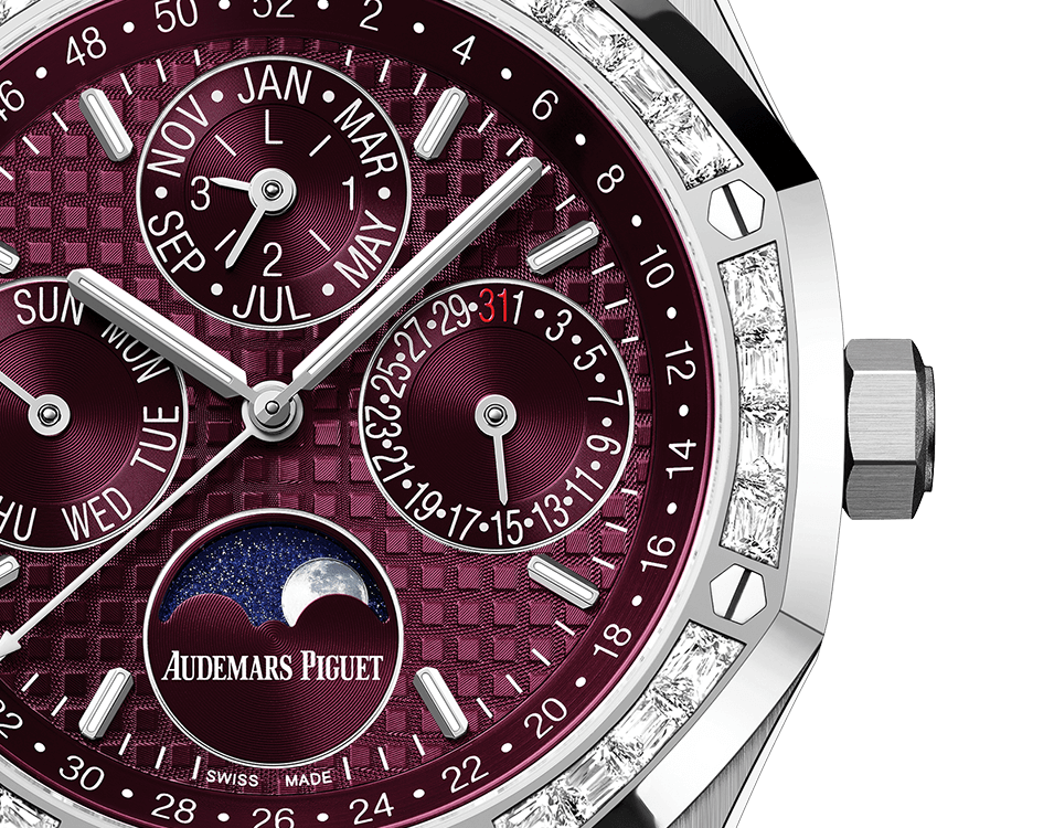 Next is the Royal Oak Perpetual Calendar’s 18-carat white gold bezel. This is lined with 32 baguette-cut diamonds. What follows is the Grande Tapisserie pattern on its purple dial with white gold applied hour markers. Along with the hands, the spines also have a coat of lume. Finally, it comes with an 18-carat white gold bracelet and ships with two rubber straps in black and purple.