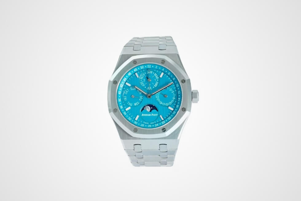 Framed by a fixed bezel, the backdrop also flaunts AP’s signature Grand Tappisserie texture for a gem-like appeal. It’s adorned with applied baton hour markers with lume applied on the spines alongside the hours and minutes hands. Sub-dials for the day, month, and date are positioned at 9 o’clock, 12 o’clock., and 3 o’clock, respectively.