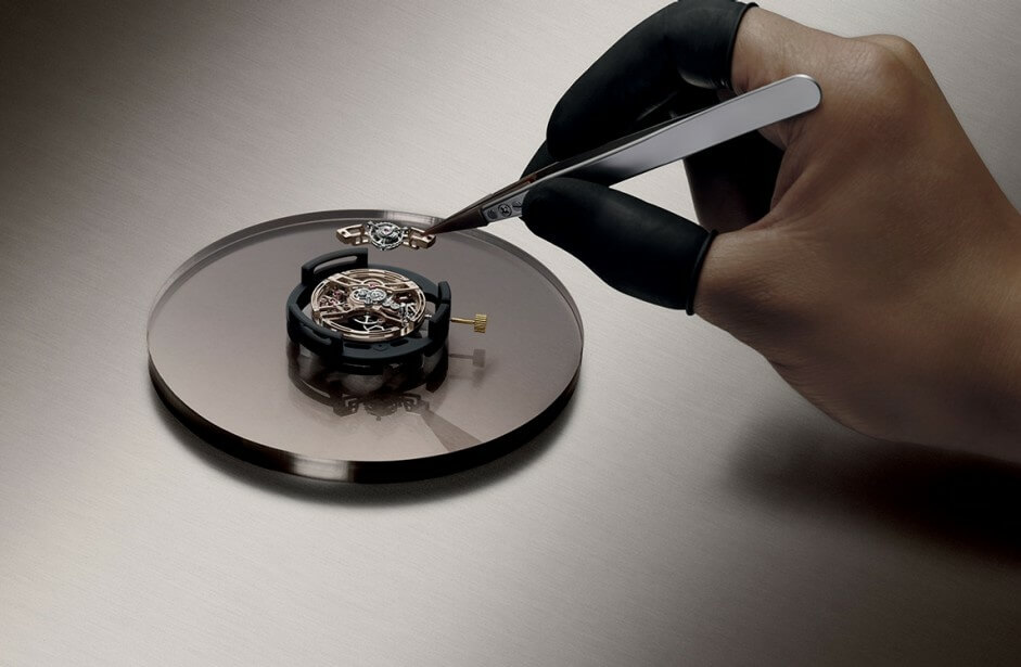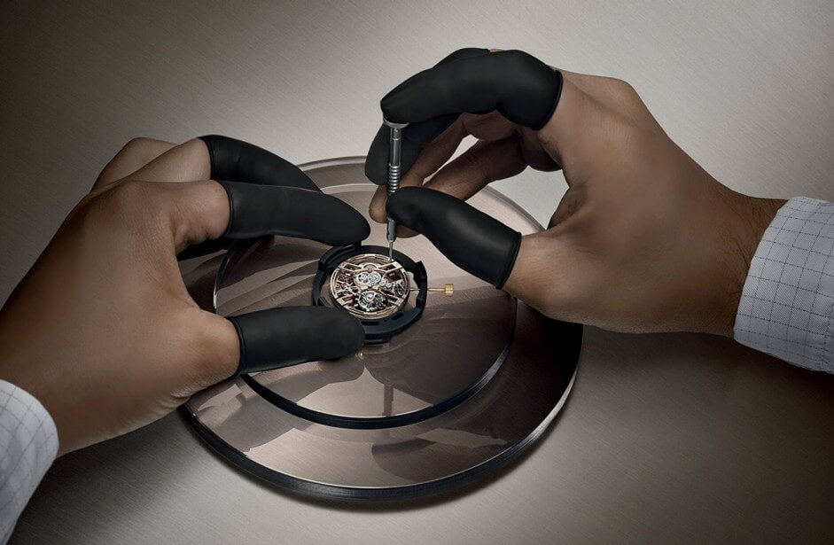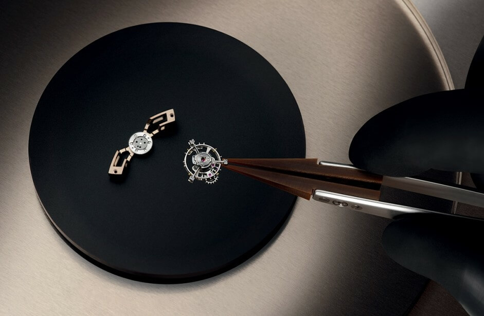 Its showstopping attributes continue as the layered skeleton dial is intentionally exposed beneath glare-proof sapphire crystals on both ends. This allows us to marvel at the sophisticated movement behind its timekeeping duties and the mesmerizing motion of its flying tourbillon.