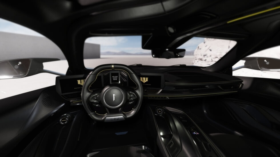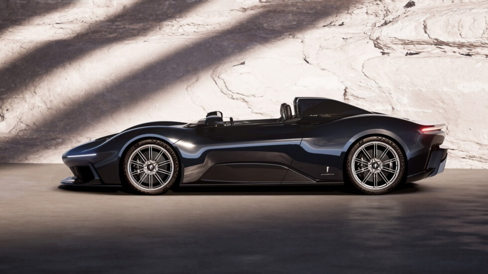 The Battista is the hardtop option available in Dark Knight (black) and Gotham (silver) paint jobs. The body is constructed out of carbon fiber which covers a full carbon fiber monocoque chassis. Outfitted with four electric drive units for each wheel, its all-electric powertrain can muster 1,900 horsepower and 1,725.9 lb-ft of torque.