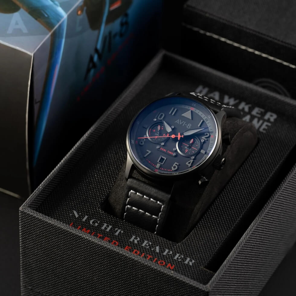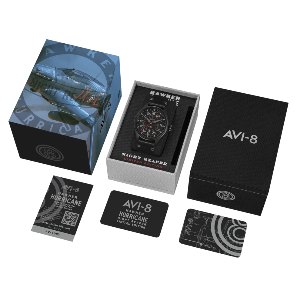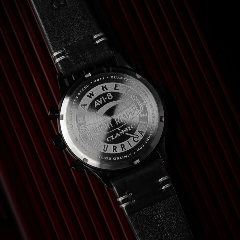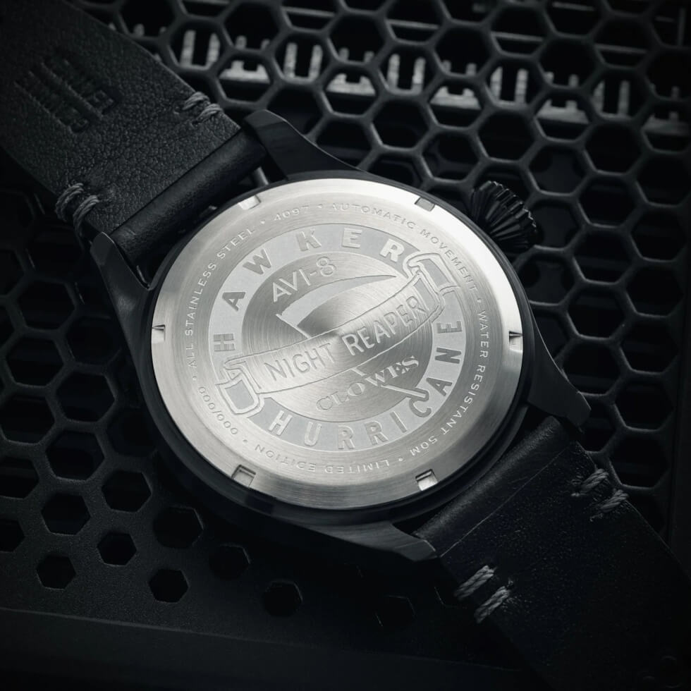 “Explore the Night Reaper Limited Editions, an exclusive capsule within the AVI-8 Hawker Hurricane family. Each timepiece, inspired by Kuttelwascher’s iconic Hurricane JX-E (serial BE581), is meticulously crafted in deep black hues,” reads the product page.