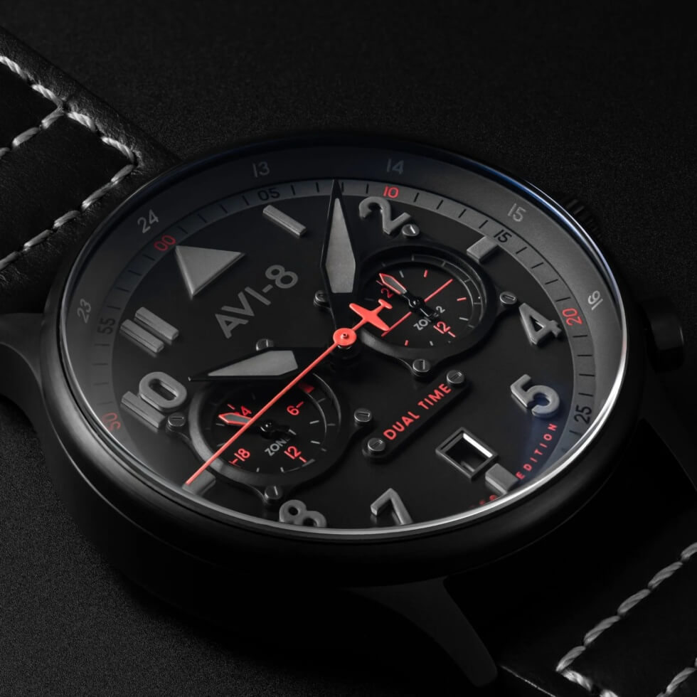 For practical reasons, AVI-8 ensures low-light readability by coating the hands, hour markers, and other indices in either Japan Super Luminous or Swiss Newlite. Both the Carey Dual Time and Classic Chronograph are powered by a Japanese quartz movement, while the Clows Automatic is the only entry with a self-winding caliber.
