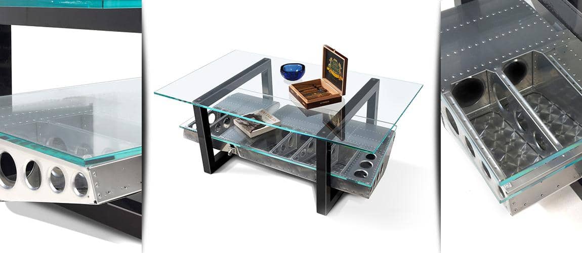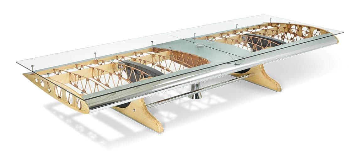 What makes MotoArt’s aviation furniture truly exquisite is the fact that they actually source their materials from real decommissioned airplanes. These double-tiered coffee tables, for instance, are built with vintage airplane wing ailerons taken from C-119 and B-25 military aircrafts.