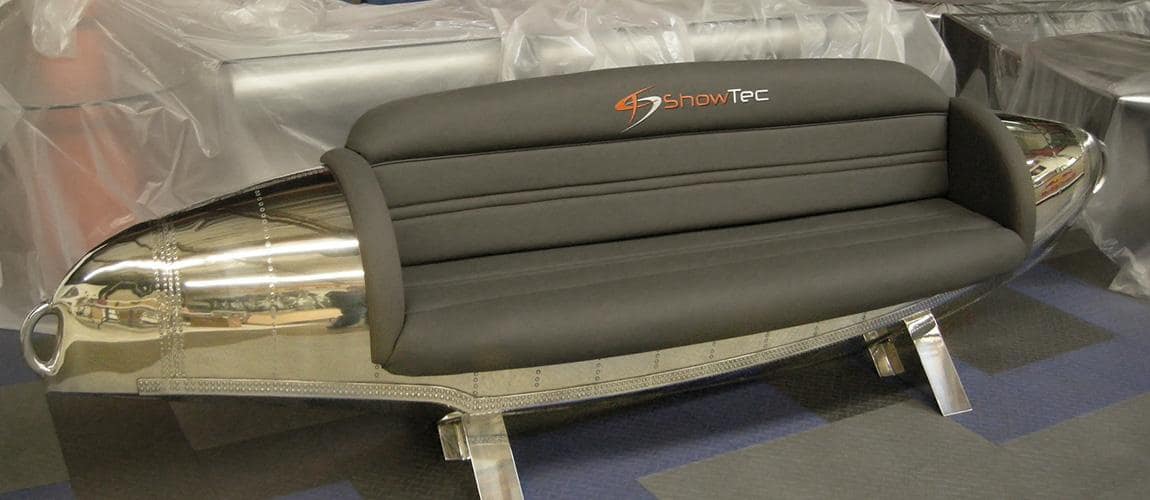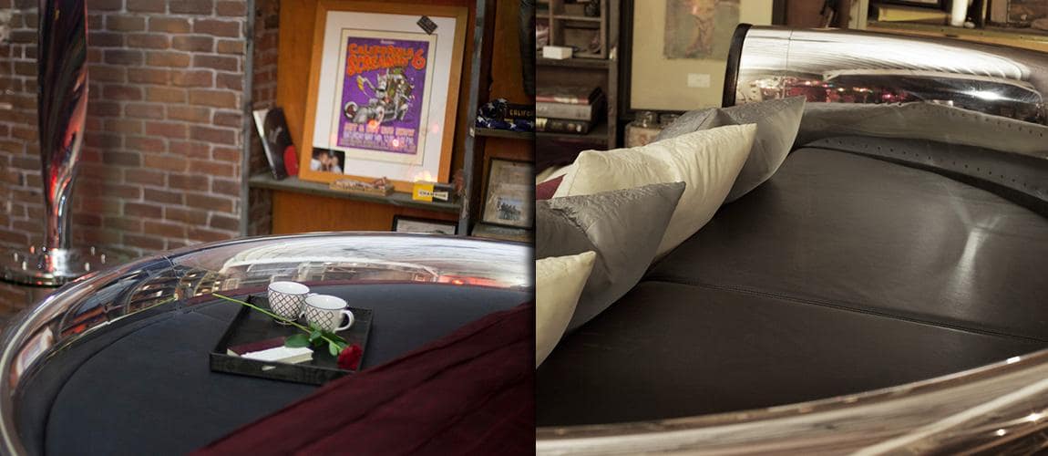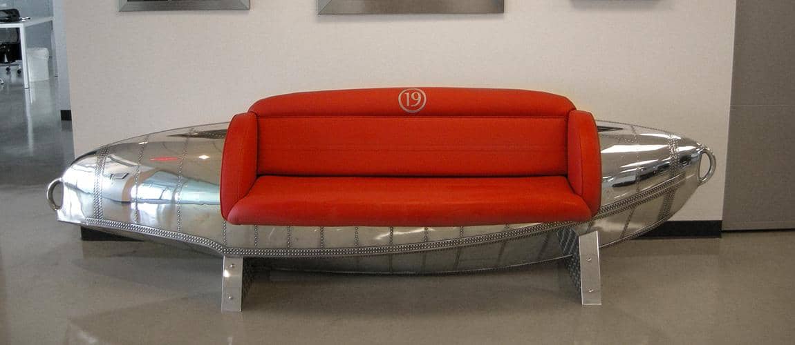 The Albatross Float Tank Couch brings a whole new dimension to the phrase “drifting away”. Carved into the pontoon of an old amphibian plane, the couch is an excellent example of aviation art furniture. The tank was carefully reconditioned and given a shiny mirror polish for extra visual appeal.
