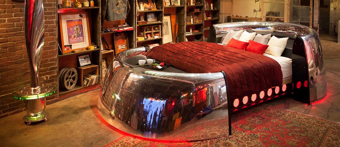 Unconventional in more than one way, the bed is round, which alone gives it extra appeal among people who look for awesome bedroom furniture. The best thing about it, though, is the giant headboard, which is essentially a genuine 747 engine nacelle cut in half.