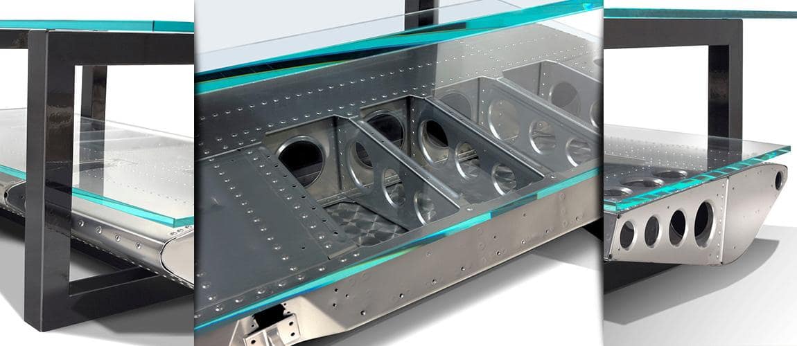 The Aileron Coffee Table flaunts reconditioned ailerons snuggly fitted in basic tubular structural frames. The frame is powder-coated for a nice texture contrast against the mirror-polished aluminum aileron. Two layers of tempered glass finish off the cool design.
