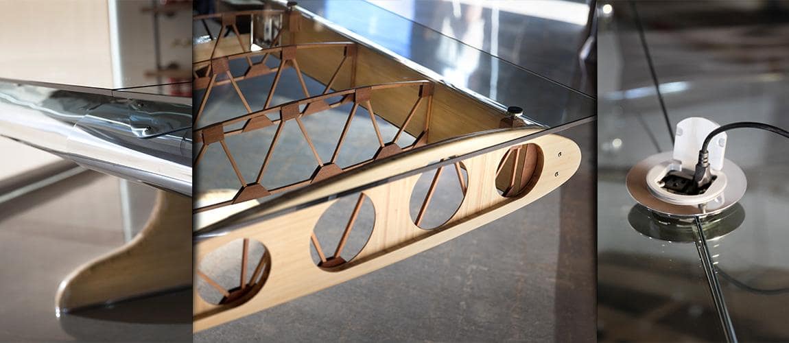 Underneath the sturdy tempered glass top lies a beautifully-crafted wing frame. It is immediately apparent that the designers over at MotoArt spent a lot of time putting together this highly detailed work of art slash furniture. The beautiful woodwork is complemented by touches of polished aluminum and a smooth polyurethane finish.