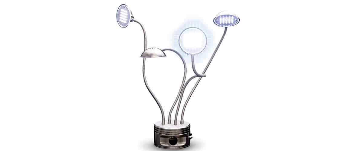 The pistons were sourced from actual engines of old decommissioned aircrafts, and they look beautiful in their simplicity. Whether you go for a spring-arm model or a multiple gooseneck one, satisfaction is guaranteed. You can find these lamps and other pieces of awesome office furniture over on the MotoArt website.