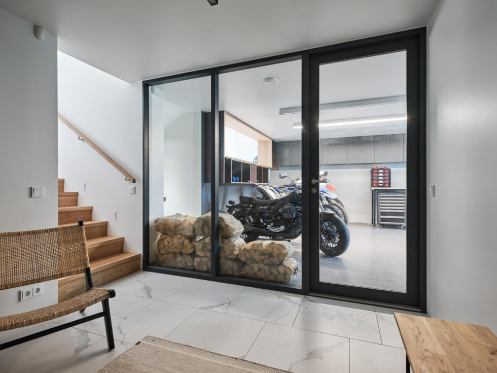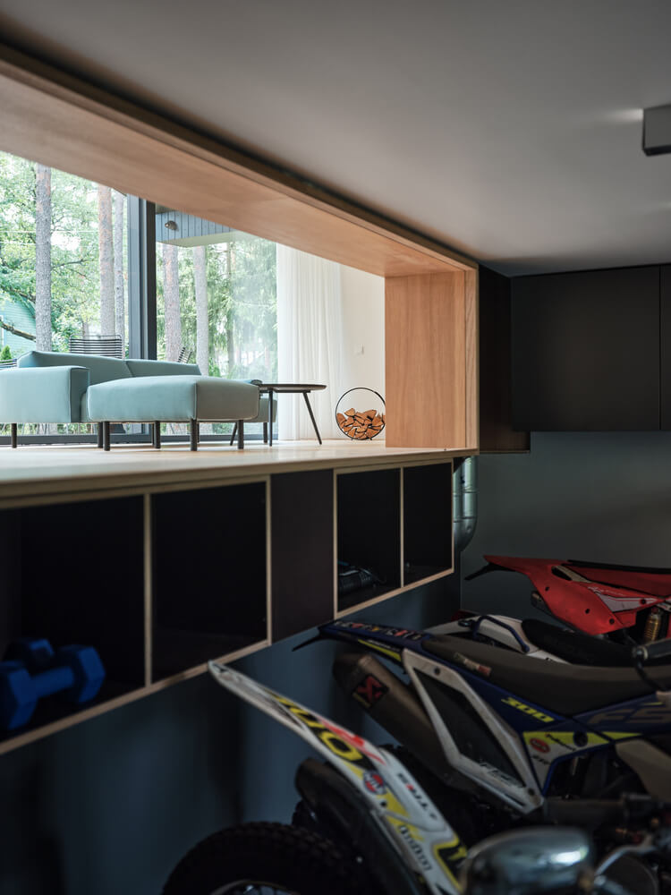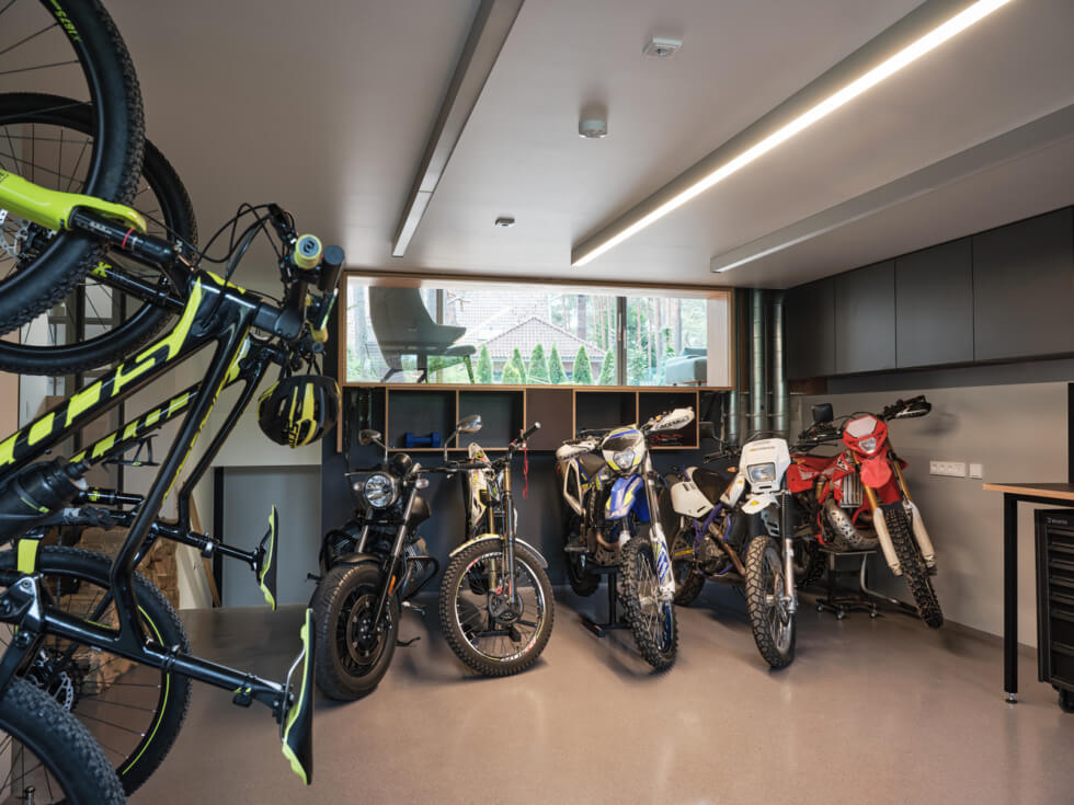 Outside of the modern facade, the Bike House boasts spatial quirks that speak of the active lifestyle of its inhabitants. The house comes in five levels, each with its own personality. The core of the house is a spotless, well-lit room with its own entrance. This room houses an impressive collection of vehicles and motorbikes.