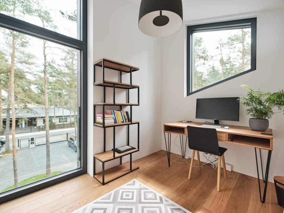 The house features generous amounts of glazing that allow the outside scenery to spill inside. It has humble geometric shapes with the main facade consisting of a two-story volume with an asymmetrical pitched roof. Meanwhile, three adjacent masses with steeped heights occupy the other side of the house. This design allows the back volume to peek out above the main facade, so the house maintains a linear visual for the observer.