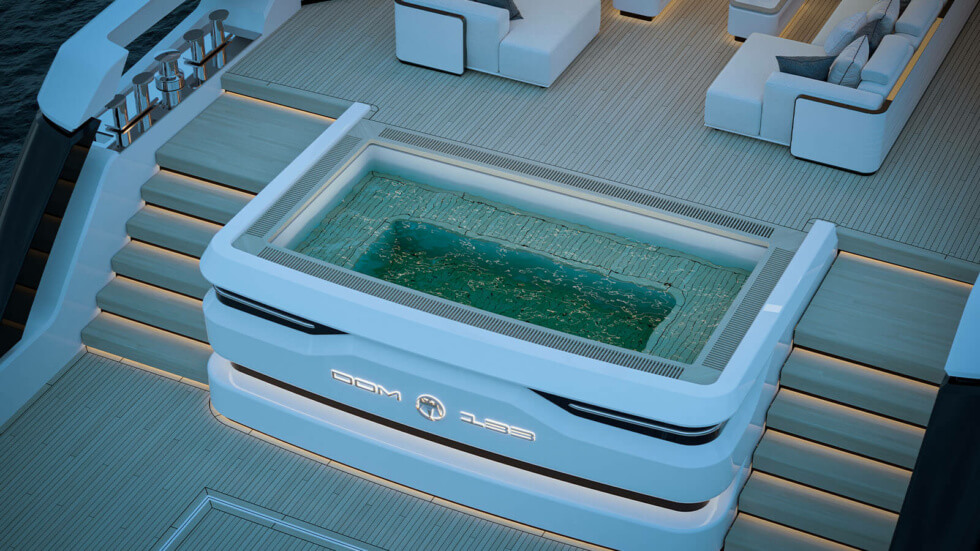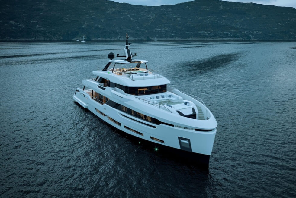 The La Spezia, Italy-based group presents a 133-foot-long monohull with a 28.5-foot-wide beam. Its construction features aluminum for both the hull and superstructure. The DOM 133 not only looks sleek and sporty. The aerodynamic/hydrodynamic silhouette also enhances its performance and range by reducing drag.