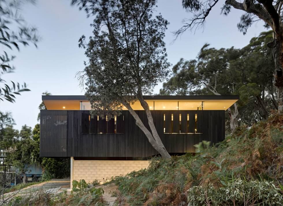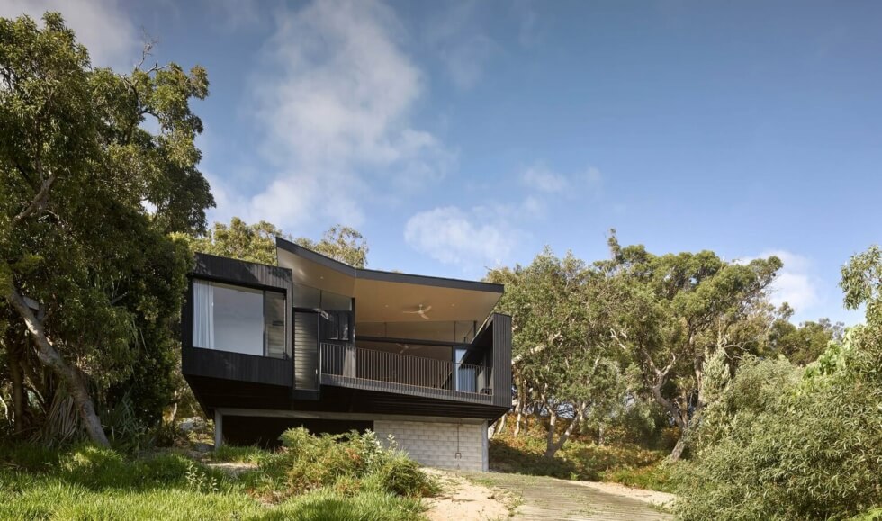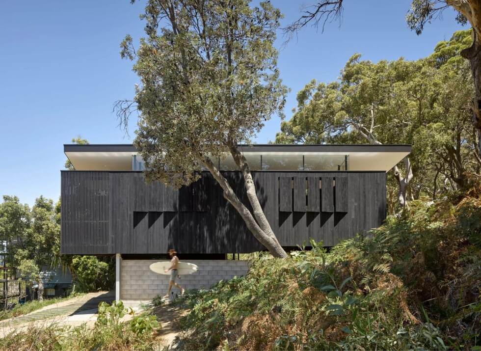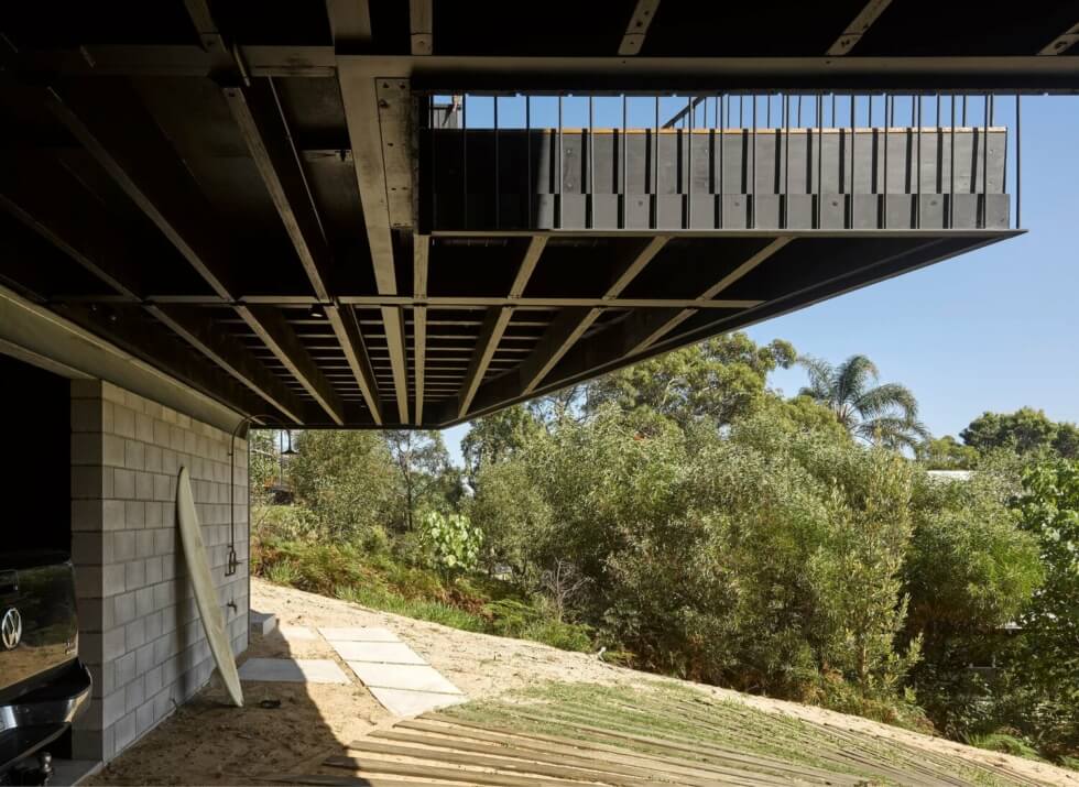 The Baker Boys Beach House is a single-story home that sits on a very steep slope. Thus, it has to be anchored well to the ground through the back part that connects to the adjoining bushland. Meanwhile, the front or other end of the house has a 4.5m cantilevered front deck that provides sweeping views of the sea beyond. It also has a covered space for parking and storage facilities.