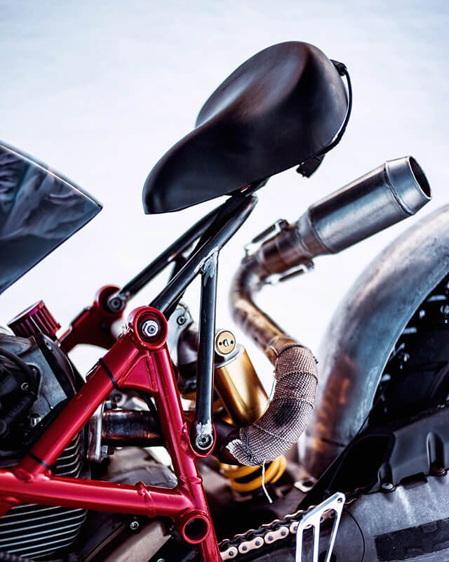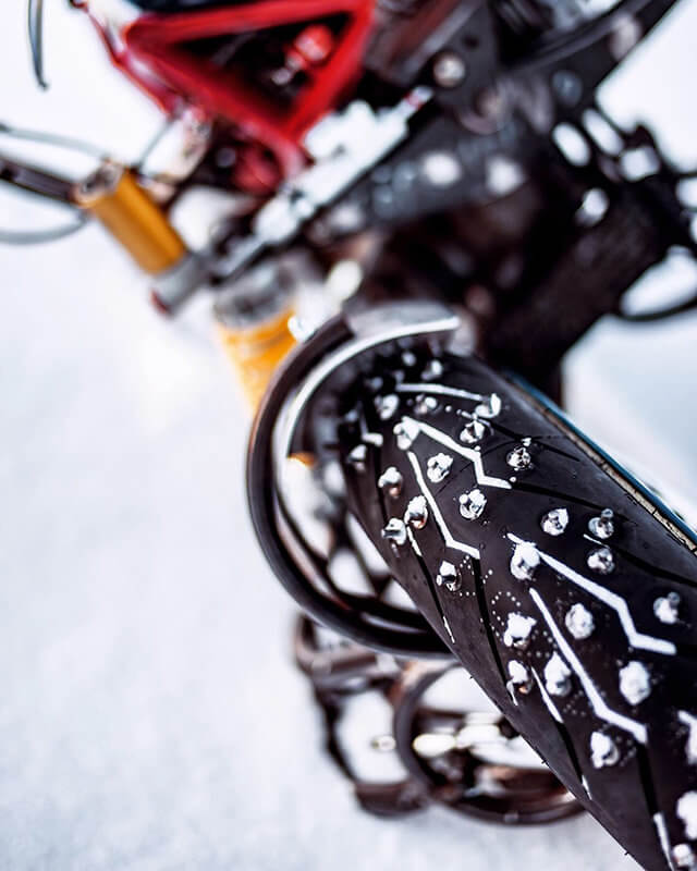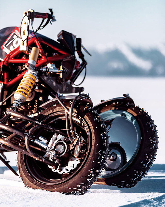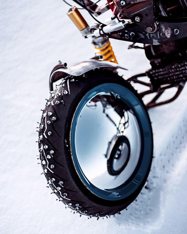 The Russian shop is crafting this three-wheeler to race in the 2020 Baikal Mile ice race. Its origin story starts with a Ducati Hypermotard drawing inspiration from Yamaha’s Niken. This design equips each of its three wheels with an independent suspension system. Sporting a separate swingarm for each one improves handling, while superior traction on the ice comes from the tires with carbide studs.