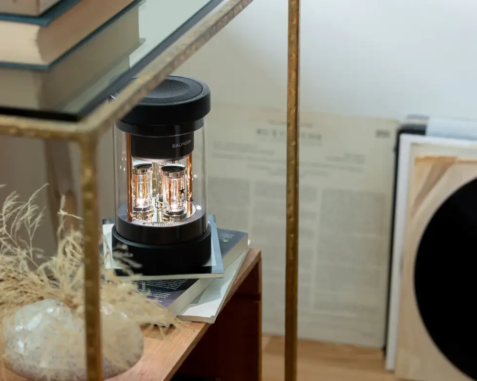 The transparent cylinder holds three LED tubes with three settings. Beat mode synchronizes the glow with your tunes with a remarkable 0.004-second delay. Ambient mode is practically the same but tones down the brightness.