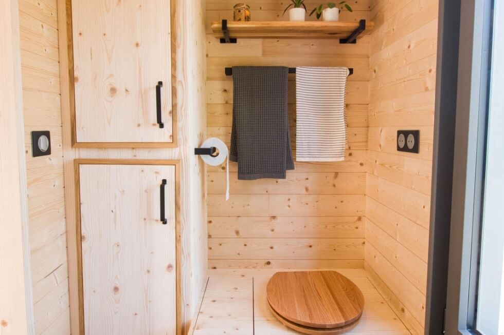 On the opposite end just a few steps away from the kitchen/dining is the living room/bedroom equipped with a two-seater sofa bed, an electric radiator, and several shelving. Three windows flank the walls, two on both sides and one overhead the bed for ventilation and light. Meanwhile, the opposite end of the Eucalyptus near the kitchen is the bathroom which is accessible via a sliding wooden door. It has a 80x80cm shower, dry toilet with stainless steel buckets and storage compartments.
